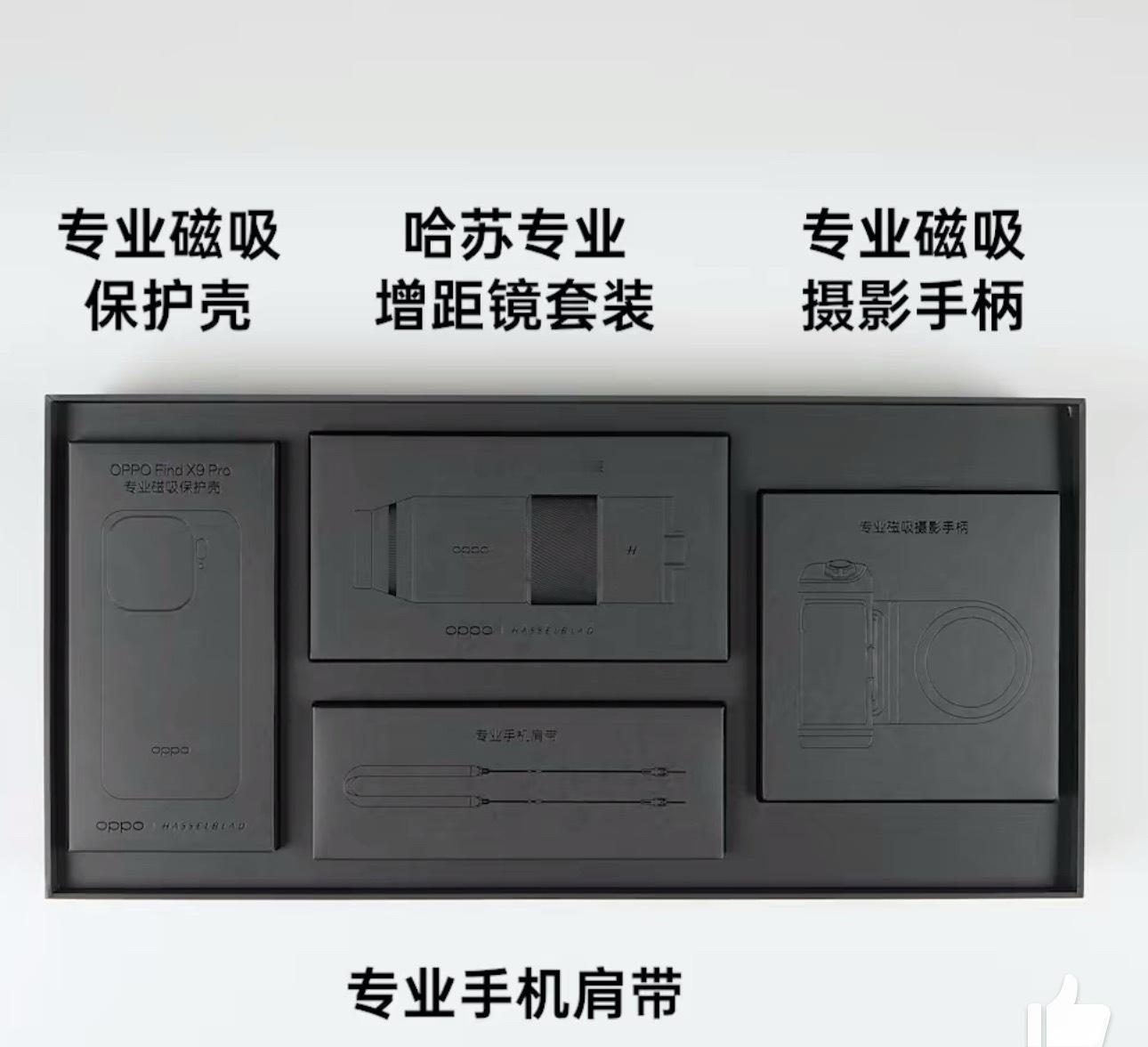 OPPO周意保首秀哈苏影像套装哈苏专业影像套装开箱,包含芳纶纤维磁吸保护壳、哈苏增距镜、磁吸摄影手柄、哈苏手机肩带等,保护壳和手柄竟然是磁吸的方式,有点意思。