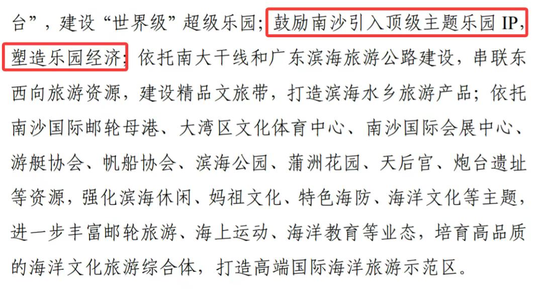 【南沙要引入顶级主题乐园IP!打造南沙自贸区国际旅游枢纽】大饼又来了!广州市文化广电旅游局正式印发《广州旅游发展战略规划(2025-2035年)》。《规划》提出以珠江文化旅游廊道为纽带,构建推动高质量发展的旅游空间布局,形成“一脉三区十片”的全市旅游空间新格局。以珠江水系为主脉,贯通北、中、南三大文旅区,塑造不同主题区段,打造汇聚全市文旅资源的珠江高质量文旅发展带。其中南部国际时尚海洋旅游区包括南沙全区以及番禺区珠江后航道以南区域,重点发展主题乐园、滨海休闲度假、邮轮游艇旅游等,打造“时尚港湾”。 其中关于南沙的规划重点还是挺多挺重磅的,最重要的一点是鼓励南沙引入顶级主题乐园IP,塑造乐园经济。南沙区可积极寻求与全球主题乐园巨头合作,谋划南沙邮轮母港与周边景区联动,设计“邮轮+主题乐园”组合产品。 而说起顶级主题乐园,相信大家想到的无非就是迪士尼和环球影城了,所以真的是一个大饼级别的规划了!当然看到"鼓励”、“积极寻求”,大家应该都清楚是什么个意思了。早前也说争取引入大型游乐园,最后揭开面纱之后没啥人知道的“多玛乐园”。个人觉得,迪士尼基本上没啥希望的,环球影城目前在华南地区还是空白的,不知道能不能争取来了。而国内品牌方面,长隆应该暂时不会扩张了,倒是方特是一个不错的选择。 而除了顶级乐园之外,规划里面还有很多南沙的重磅规划挺,有看点的如下: 推动国际邮轮母港与港澳游艇自由行联动 加快建设国际高端酒店集群、跨境免税购物综合体及国际会展中心 联动港澳开展“一程多站”旅游推广 策划国际帆船赛、艺术季等品牌活动 吸引更多全球邮轮企业地区总部和全球运营中心落户,打造邮轮企业总部基地 加强国内国际城市邮轮合作互通,开发“一程多站”的国际邮轮精品航线 争取推动扩大游艇航行水域,打造海钓、潜水观光、帆船帆板、登岛探险等游艇旅游产品