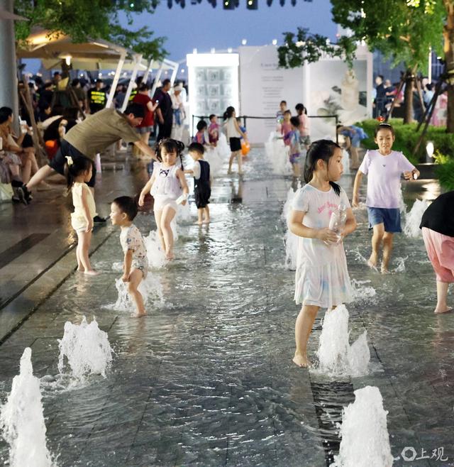 傍晚时分的徐汇滨西岸梦中心,孩子们在戏水。