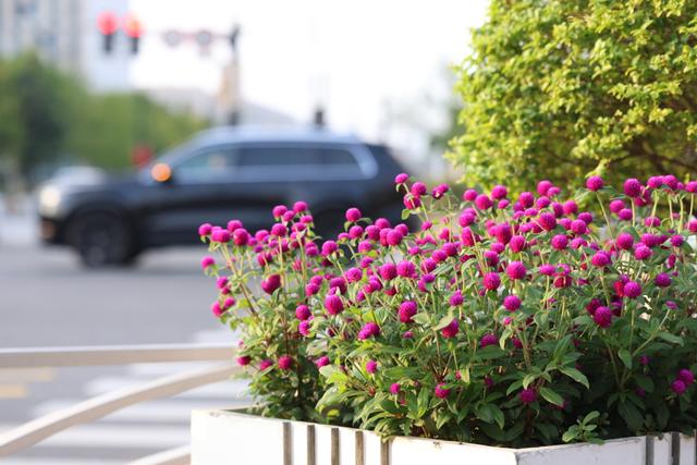 申城街头绿带呈现“秋花已绽,夏绿未退”的景象。