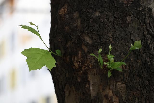 申城十月中旬依旧闷热难耐,酷暑时节才会有的“老树吐新芽”现象,如今随处可见。