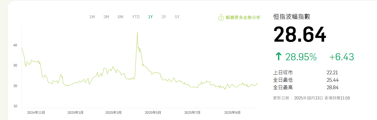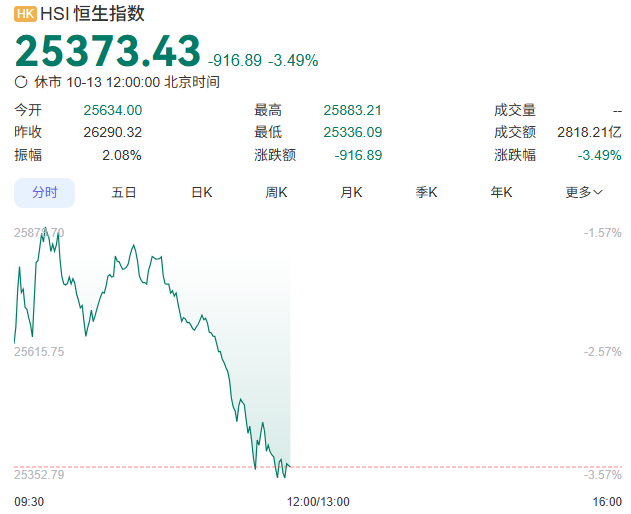 上证报中国证券网讯(李子健记者周亮)10月13日早盘,港股低开低走,截至早盘收市,恒生指数跌幅扩大至3.49%,报25373.43点。港股版“恐慌指数”恒指波幅指数飙升近29%,创2025年5月以来新高。