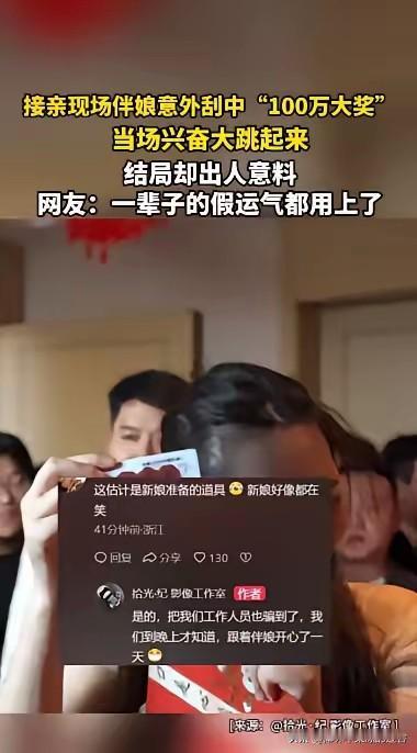 伴娘心里想:我刮出100万元了,我要发财了,伴娘兴奋不已,没想到新娘却说这是道具彩票,伴娘心里那个失落啊! 这就是所谓的起起落落吧~ 伴娘兴奋不已,心想着我发财了,我发财了,没想到新娘却说这是道具彩票,只是用来营造接亲气氛的,根本刮不出100万元,伴娘的心情一下子从100%高兴变成了0%失落。网友也是感叹:这就是人生的大起大落!