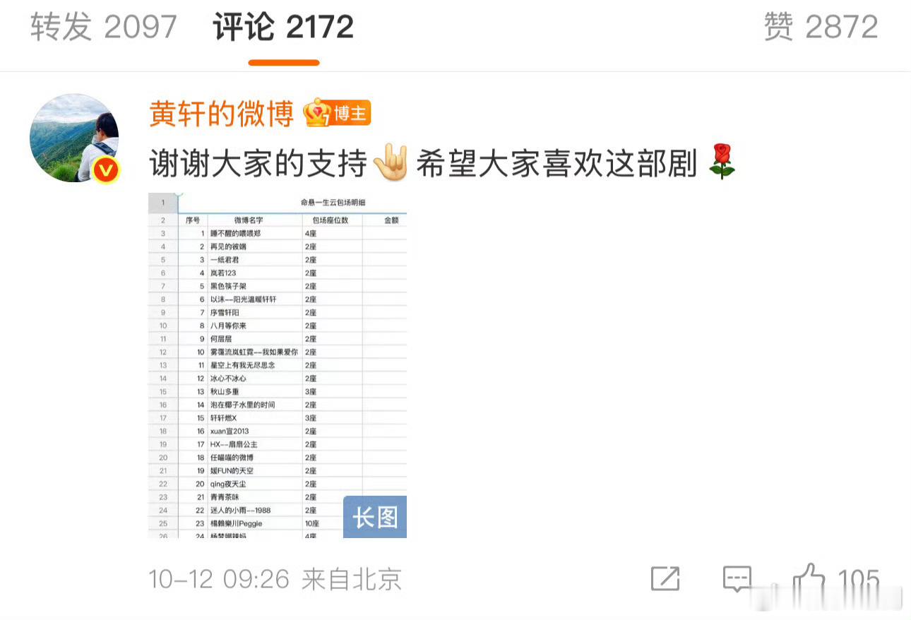 黄轩发了小表格(影迷会总结的给命悬一生云包场的粉丝名单),特意发出来感谢 ,现在