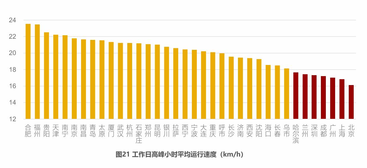 新一年度主要城市道路网密度报告发布,西安以6.4km/km²居第19位,低于全国36城平均6.6km/km²水平。而在道路监测数据上,工作日及周末高峰运行时速均有1km以上提升,虽碑林区路网密度居首,但其高峰时期车速仅18.5km/h,拥堵情况严重。西安