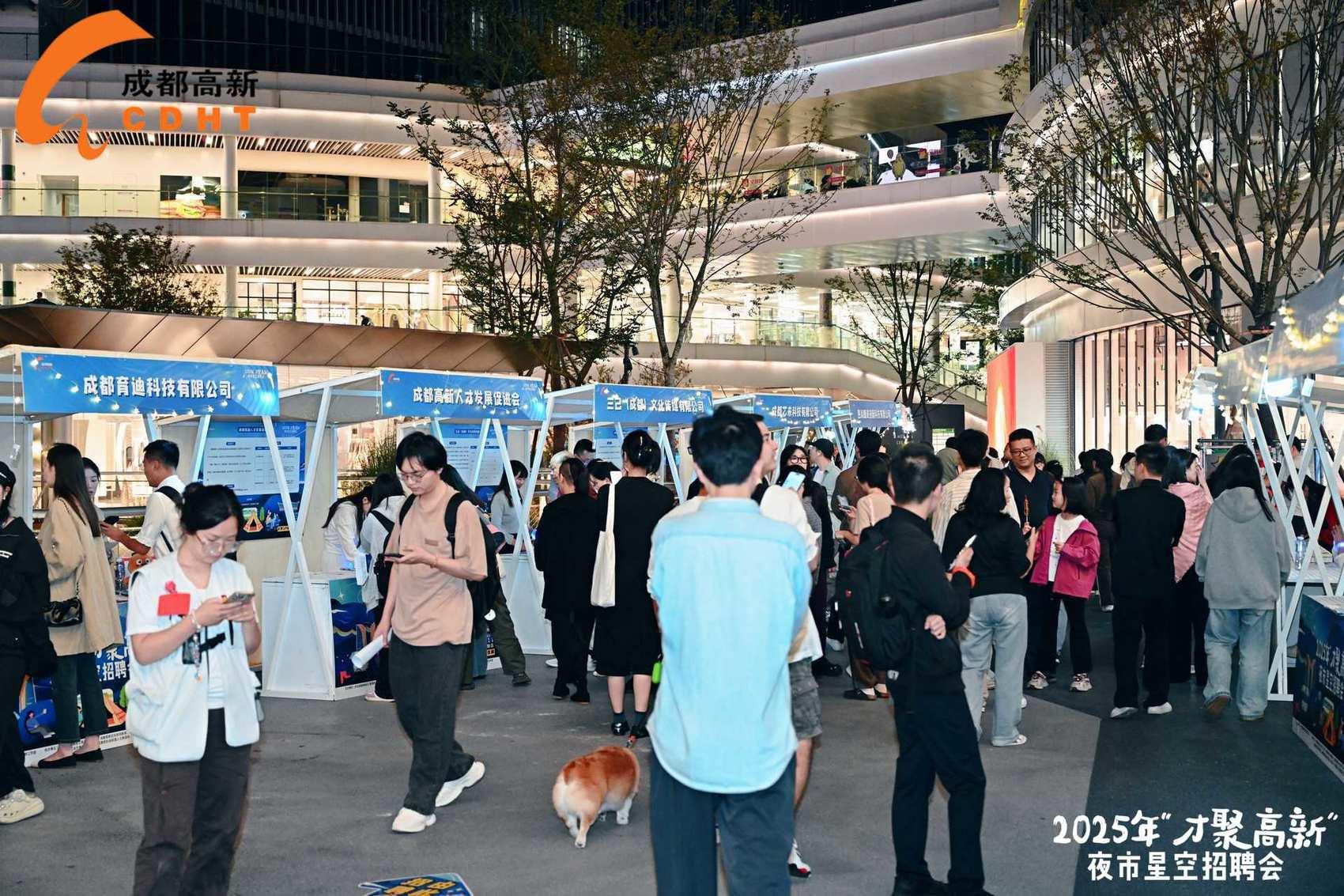 10月11日晚,国内首个骑行主题商业公共空间——成都此地CyPARK内,2025年“才聚高新”夜市星空招聘会正在进行,吸引不少年轻人前来求职。