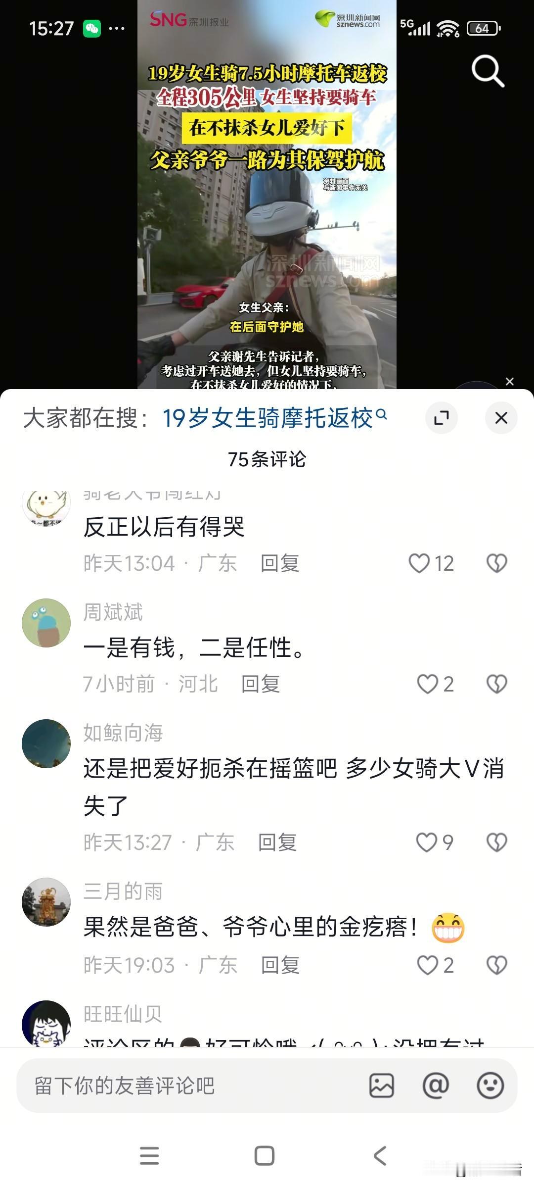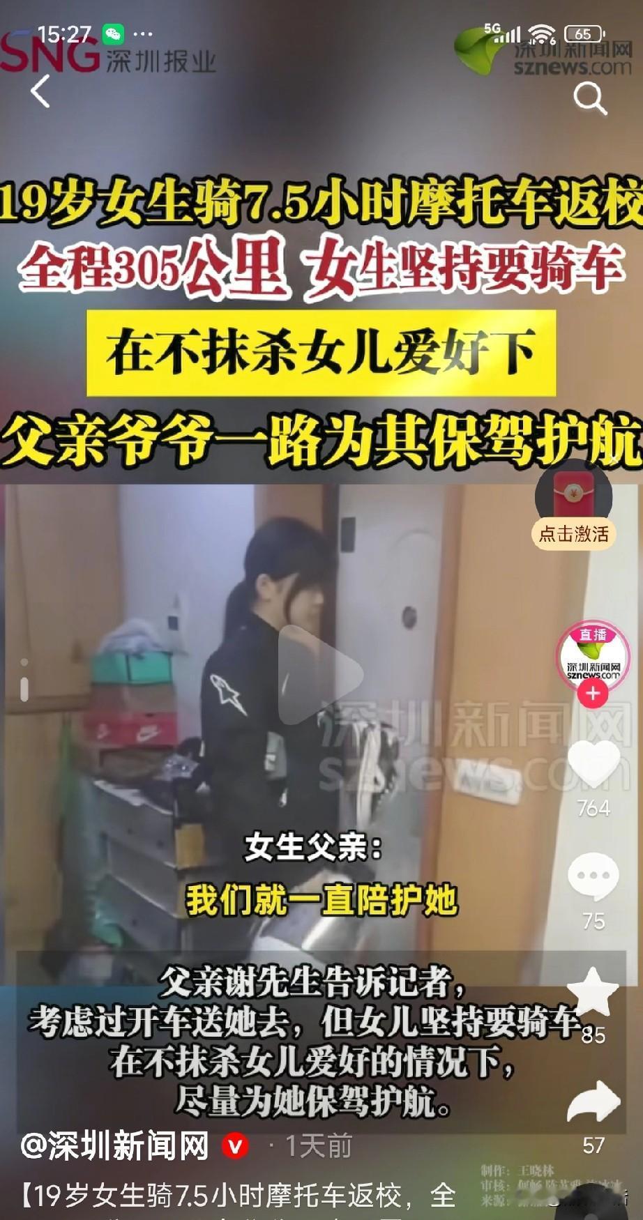 看这爸爸还挺骄傲的?19岁女儿,大一新/生,骑2万摩托车返校,305公里,7个小时,父亲和爷爷开车一路跟随护航! 一是有钱,二是任性, 这样的一辆机车,少说2万起步,还有全套的骑行服,看来“富养女儿”,这家是做到了! 本来走高速用3个多小时, 只因为女儿喜欢,骑自己的“机车”上路, 不能走高速,从早上4点多,走了7个小时,11点才到学校! 不过女儿虽风尘仆仆,一定是骄傲满身! 看她的样子,平时长发及腰,温顺可人,一旦骑上“机车”,就变得英姿飒爽了,也许这就是小女生的“两面性”! 不过这么个庞然大物,放不进宿舍,也不方便扔在楼下吧?是爸爸骑回去,还是自己就近租房子,安置它? 有钱任性,不过机车速度挺快的,如果没有爸爸的护航,女孩还会保持慢速行驶吗?平时开快了,100多,还是很危险的呢! 还是小心驾驶为好!