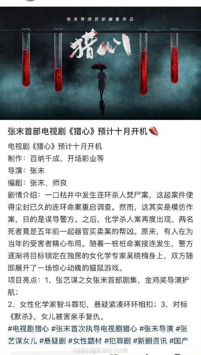 张艺谋女儿张未首部导演剧集猎心阵容班底 张艺谋女儿张未首部导演剧集猎心阵容班底!张小斐,于适主演!明天开机!