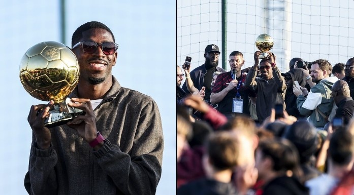 法国足协晒照,登贝莱回到成长之地埃夫勒,向家乡人民展示了他的金球奖。