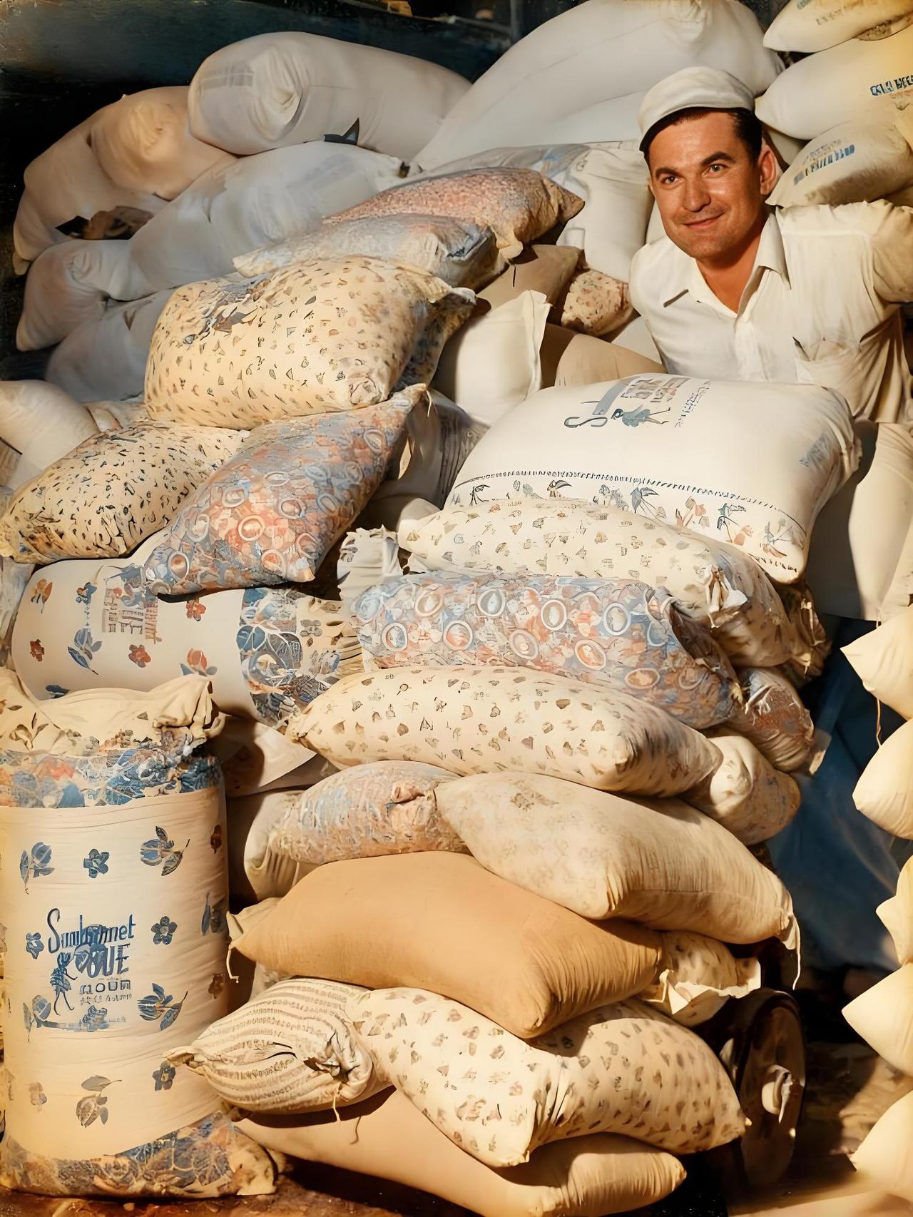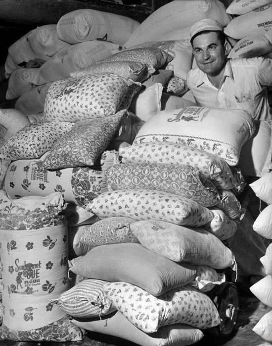 这张拍摄于1939年大萧条时代的照片,画面里,大量印有花纹图案的面粉布袋堆叠着,花纹样式丰富多样,有的带着精致的碎花,有的是复古的几何纹路。布袋上的文字部分,采用了可清洗的油墨印制。在大萧条的背景下,这样的设计十分贴心,穷人家可以将用完面粉的布袋清洗后,直接用来制作衣服,既物尽其用,也为困顿中的人们提供了一丝生活的便利与温暖。