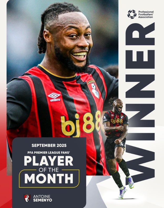 直播吧10月13日讯PFA(英格兰职业球员工会,ProfessionalFootballers'Association)官方宣布,伯恩茅斯边锋塞梅尼奥当选球迷票选英超9月最佳球员。