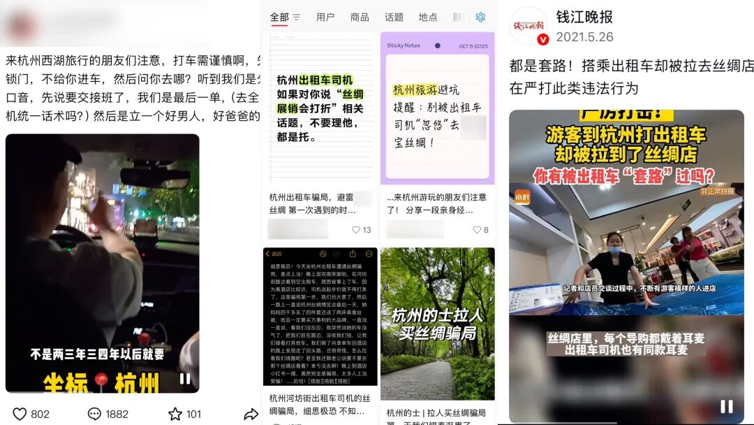 潇湘晨报记者在社交平台上搜索,发现不少网友有同样的遭遇,司机在车上推销丝绸展,有的乘客还被带到丝绸展并购买了高价商品。而据媒体报道,杭州有关部门曾多次打击出租车拉游客到丝绸的套路。