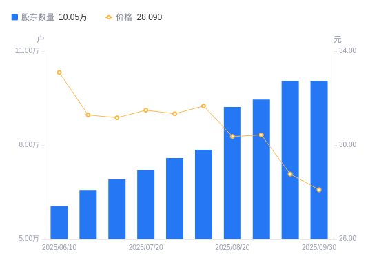 日期A股户数(户)流通A股户均持股数(股)户均持股市值(万元)2025-09-3010045316551.9646.492025-09-2010039416561.6947.632025-08-319448717597.0753.552025-08-209214618037.1854.762025-08-107843821189.4067.092025-07-317579221929.1568.702025-07-207206023064.8672.612025-07-106902324079.7175.032025-06-306562525326.5479.222025-06-106048327479.6990.93