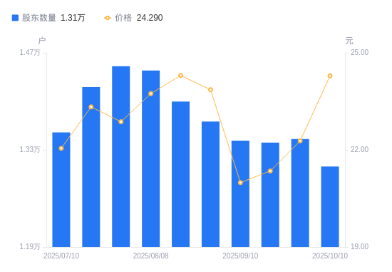 日期A股户数(户)流通A股户均持股数(股)户均持股市值(万元)2025-10-101306117790.2543.212025-09-301345717266.7438.472025-09-191340517333.7237.012025-09-101343517295.0136.302025-08-291370816950.5740.442025-08-201399716600.5940.342025-08-081444416086.8538.192025-07-311450616018.0936.632025-07-181420616356.3638.162025-07-101355317144.4337.80