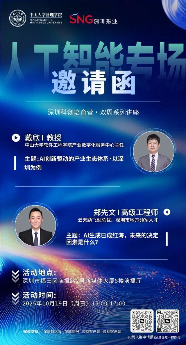 为进一步激发深圳创新动能,中山大学管理学院创业学院与深圳报业集团深圳特区报社强强联合,联动政府相关部门,以“每月双周固定科技讲座”为核心载体,携手构建“科技讲座+传播放大+政策护航”三位一体的科创培育平台——“深圳科创培育营·双周系列讲座”,优先聚焦人工智能领域,致力于打造湾区最具活力、转化效率最高的产业社群。