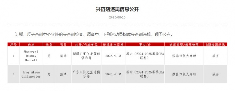 中国篮协在给广东东阳光队(广东宏远篮球俱乐部)下发的通知中说:“在国家体育总局反兴奋剂中心于2025年4月16日实施的赛内(2024-2025赛季CBA)兴奋剂检查中,你单位男子篮球运动员TroyAkeemGillenwater(吉伦沃特)的A样本尿样检测结果呈大麻酚类(羧基四氢大麻酚)阳性。接到阳性通知后,运动员放弃检测B样本,因此该运动员检测结果阳性成立,表明运动员曾使用禁用物质或禁用方法,构成兴奋剂违规。运动员对该阳性作出了解释说明,并提供了证据材料。运动员能够证明在赛外摄入、使用禁用物质,并且与运动能力无关。接到兴奋剂违规通知后,运动员在规定时间内签署了结果管理回执单,承认兴奋剂违规,接受通知中指控的后果。”