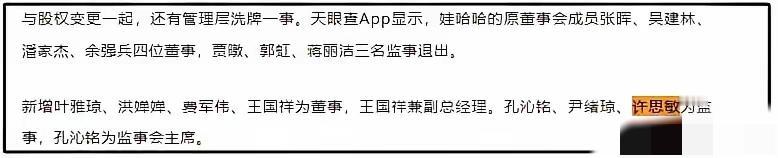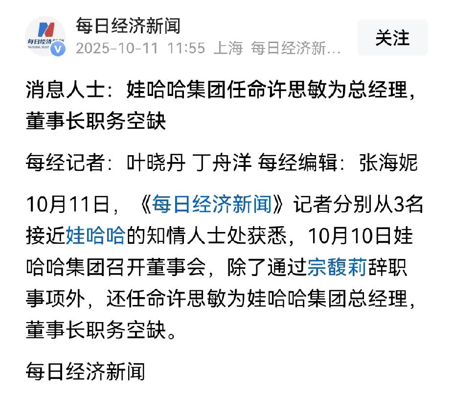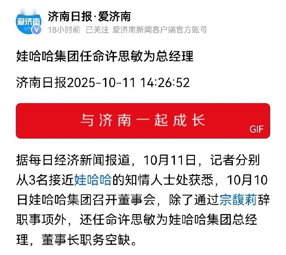 总觉得宗馥莉辞去娃哈哈董事长一职是以退为进,垂帘听政。宗馥莉不像是网上说的那样途穷末路。 虽然宗馥莉辞去了娃哈哈董事长、法人代表一职,但许思敏却接任了娃哈哈总经理。许思敏原来是宏胜集团的法务部长,是宗馥莉的亲信。 另外宗馥莉在当董事长的时候,娃哈哈原董事会成员张晖、吴建林、潘家杰等人退出,这些人应该是娃哈哈的老臣。 新增了叶雅琼、洪婵婵进入董事会。一看名字就知道是宗馥莉的人。叶雅琼是宗馥莉一手提拔的娃哈哈政务总监,而 洪婵婵是宏胜集团的财务总监。 所以这次宗馥莉辞职,但在董事会安插了自己人,并任命心腹当总经理,依然掌握着娃哈哈的大权。 而从娃哈哈辞职也有利于自己从漩涡中抽身,从而打造属于自己的品牌。可笑的是外界还以为宗馥莉不行了。 目前娃哈哈董事长是个烫手的山芋。因为不管谁上台,宗老登这18亿美元,折合人民币超百亿的信托资金是个迈不开的问题。宗老登当初必然用了非法手段转移资金,要是不管的话一个国有资产流失的问题就兜不住,要是管了把这些钱追回来的话,就会得罪杜建英一系,而杜建英一系在娃哈哈集团有很深的影响。 如果娃哈哈董事长没人敢接的话,接下来还得请宗馥莉回来。到时候宗馥莉肯定比现在傲娇的多。
