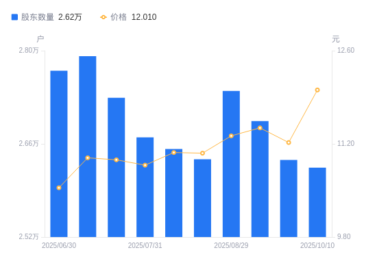 日期A股户数(户)流通A股户均持股数(股)户均持股市值(万元)2025-10-102624239612.6747.572025-09-192635739439.8344.252025-09-102694138584.8944.142025-08-292739437946.8442.962025-08-202636839423.3843.602025-08-082652339192.9943.392025-07-312669938934.6342.362025-07-182729138090.0541.752025-07-102791837234.6040.922025-06-302769937529.0039.56