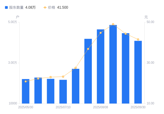 日期A股户数(户)流通A股户均持股数(股)户均持股市值(万元)2025-09-30408222782.2111.552025-09-19445492549.4511.302025-08-20486032336.8011.452025-08-08464272446.3210.952025-07-31418172716.0110.012025-07-18270424199.9711.572025-07-10216575244.2912.172025-06-30221185134.9811.812025-06-20227424994.0511.122025-05-30220255156.6310.76