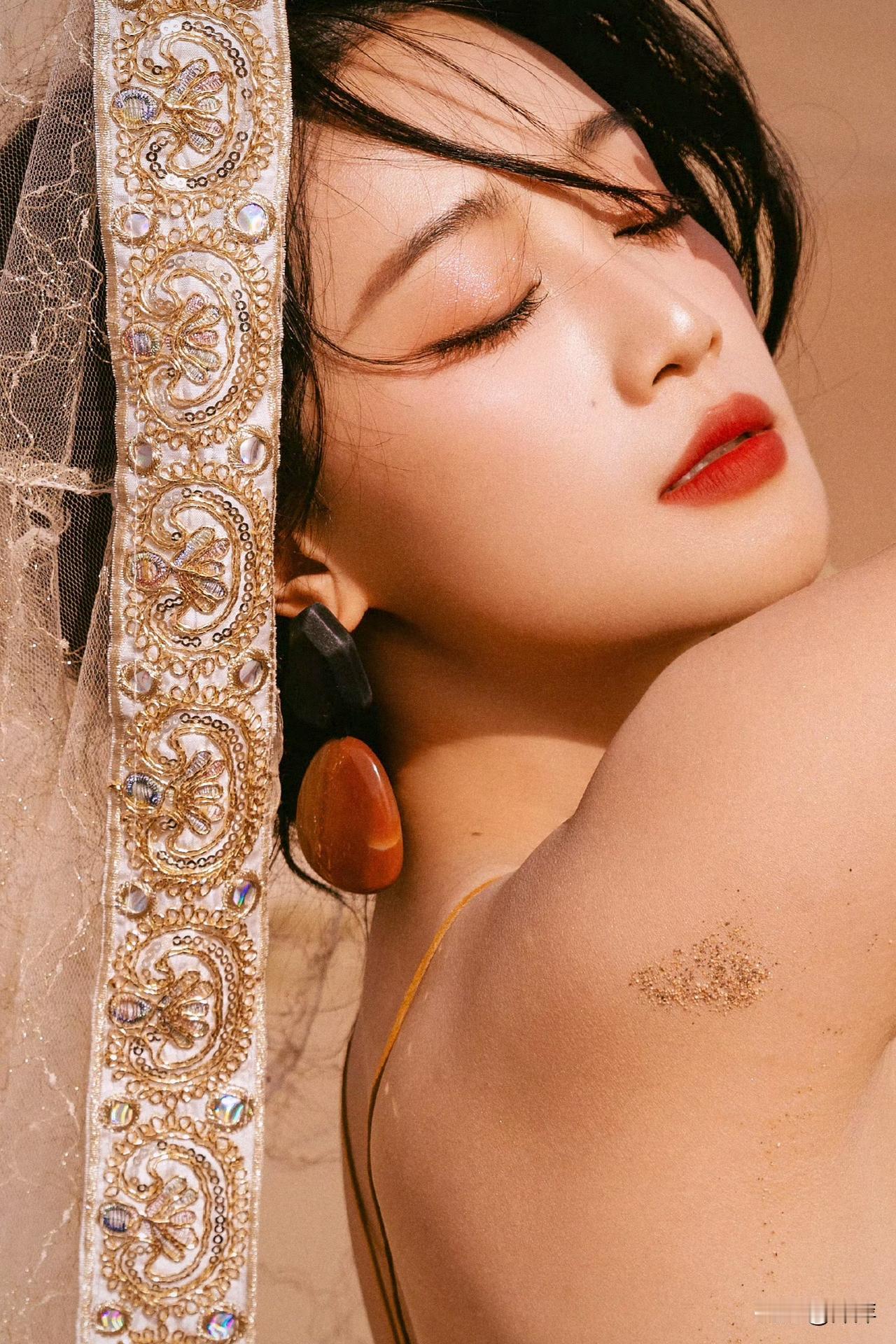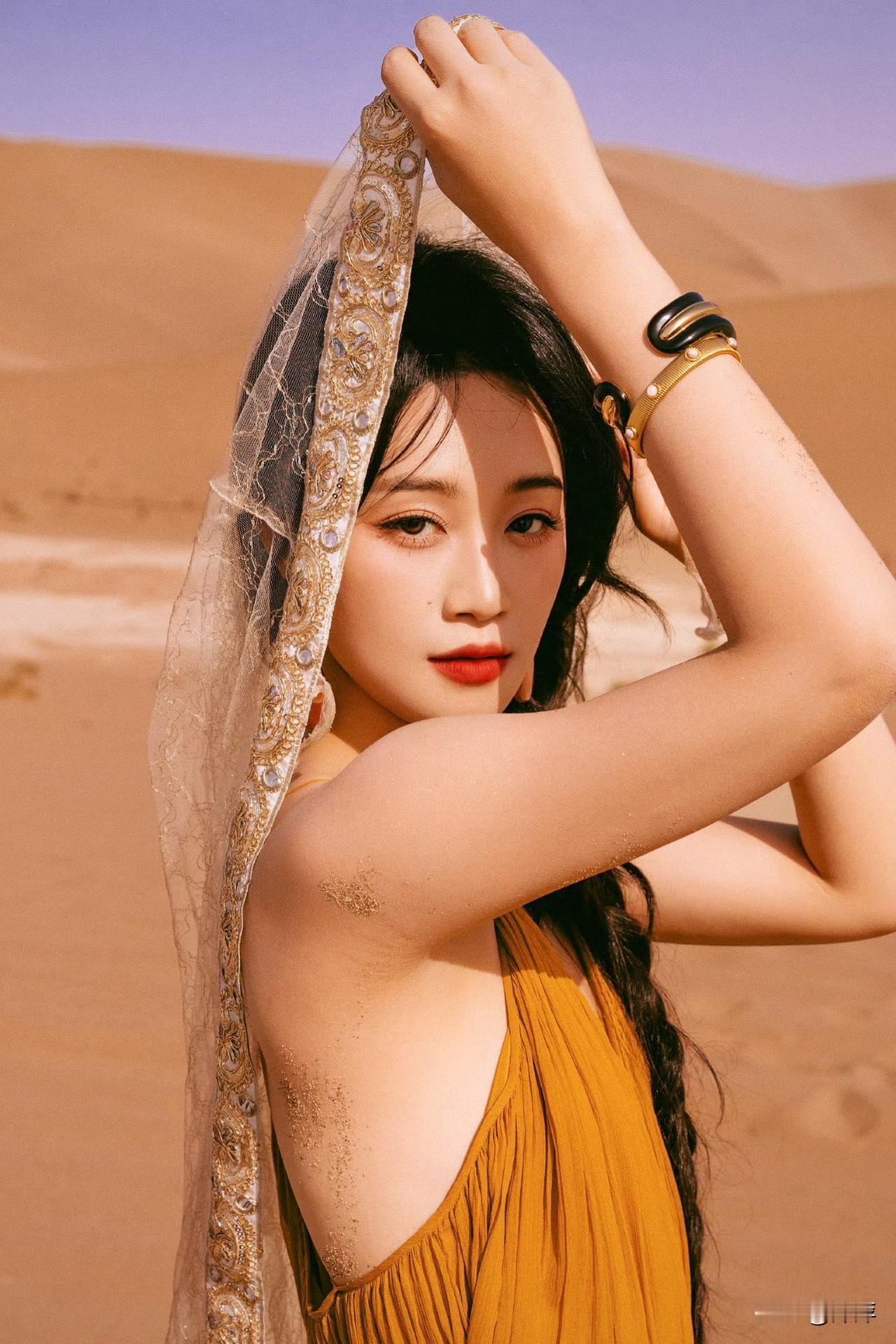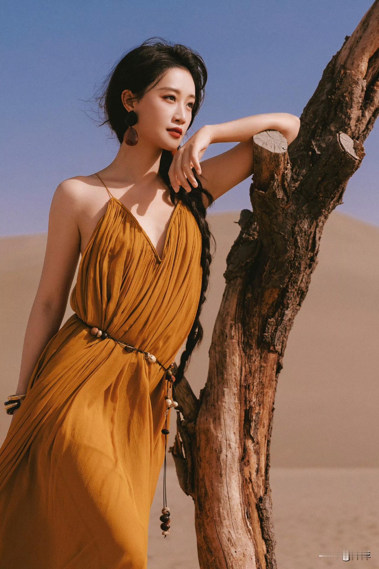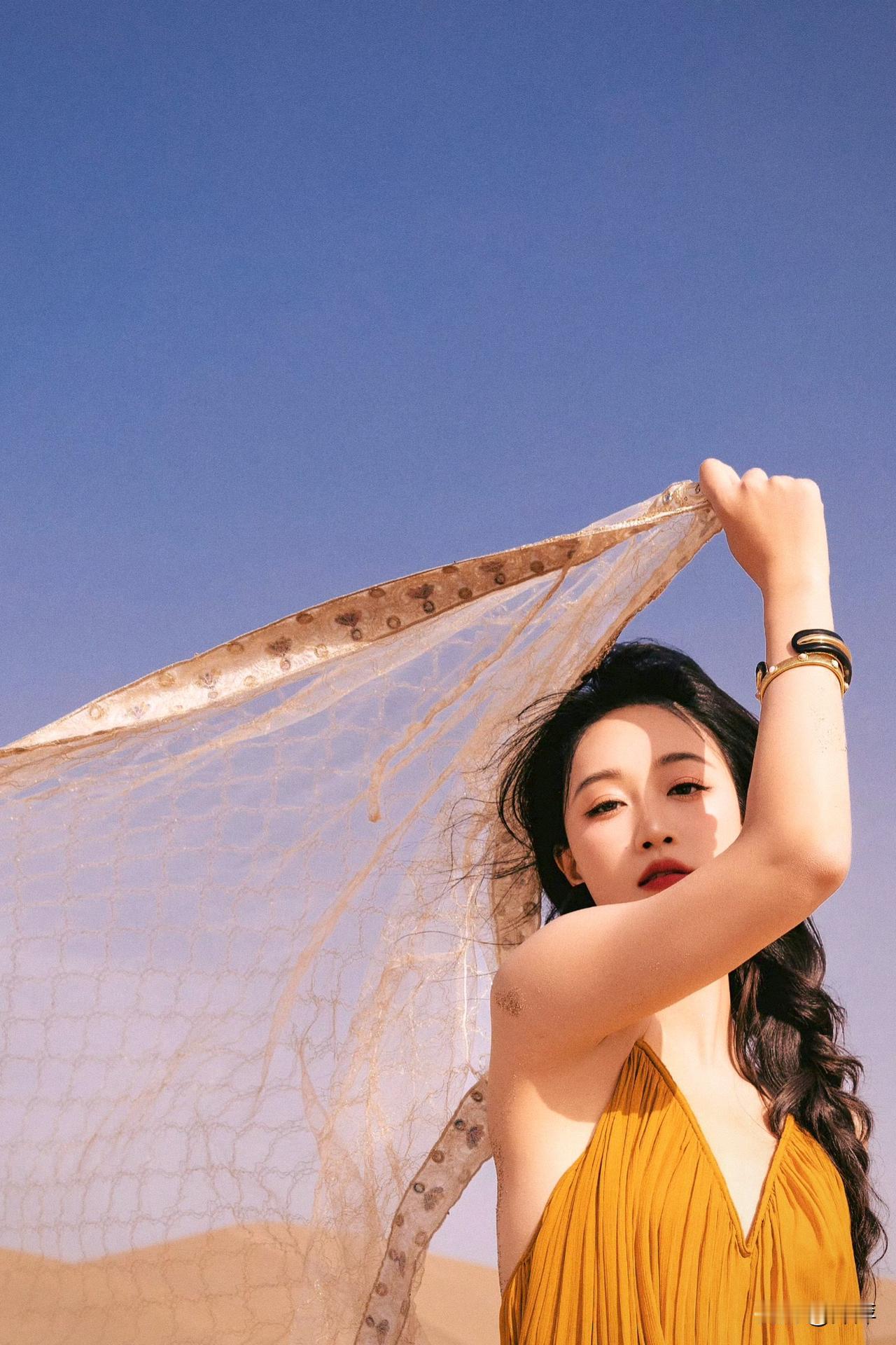 蓝盈莹.沙漠中黄裙配纱巾,红唇亮眼,身姿曼妙,与大漠风光相融,又美又有氛围感,在沙海背景下,美得如沙漠玫瑰般热烈又耀眼。