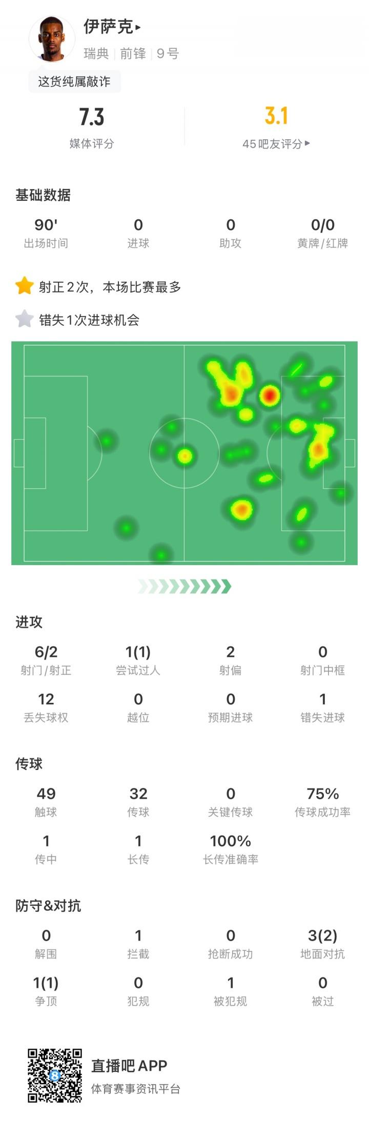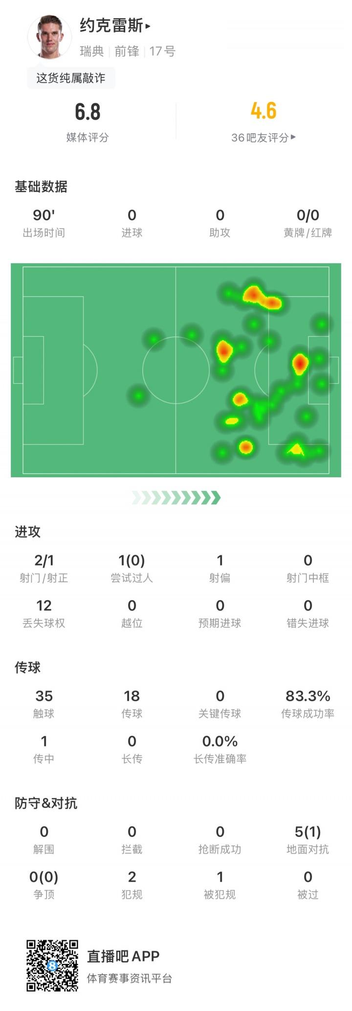 本场约克雷斯、伊萨克均首发打满全场,伊萨克全场6射2正0球,1次错失良机。约克雷斯数据为2射1正0球。