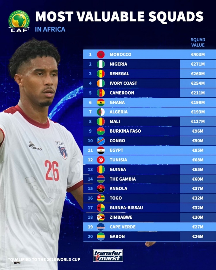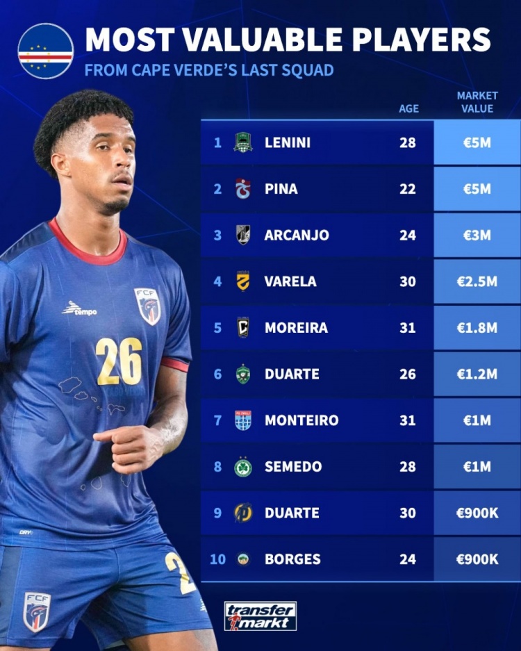 佛得角阵容总身价2700万欧元,非洲球队之中仅排在第19位,而首位摩洛哥总身价高达4.03亿欧元。佛得角身价最高的球员为莱尼尼、皮纳,两人德转身价均为500万欧元,仅8名球员身价达到100万欧或以上。