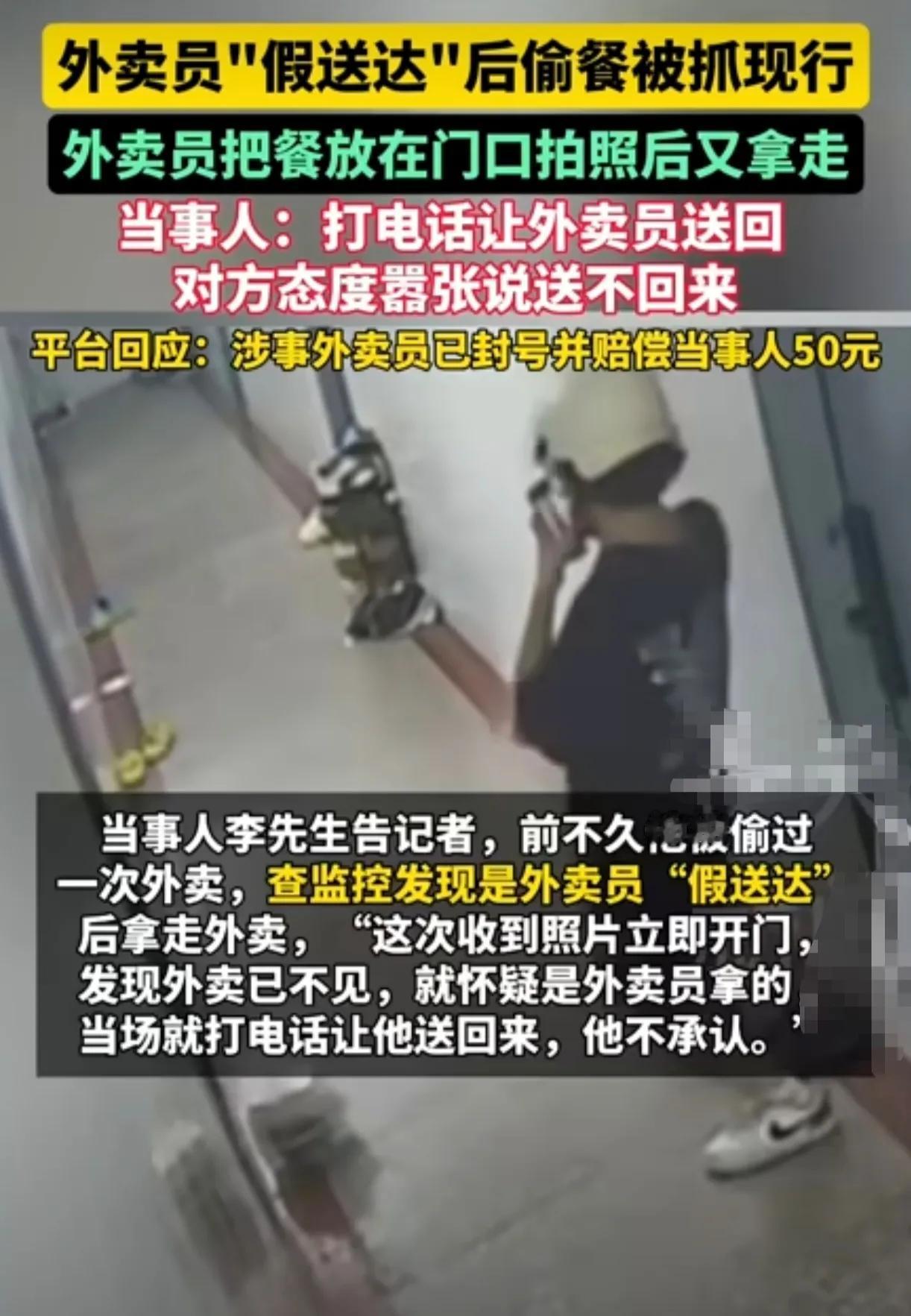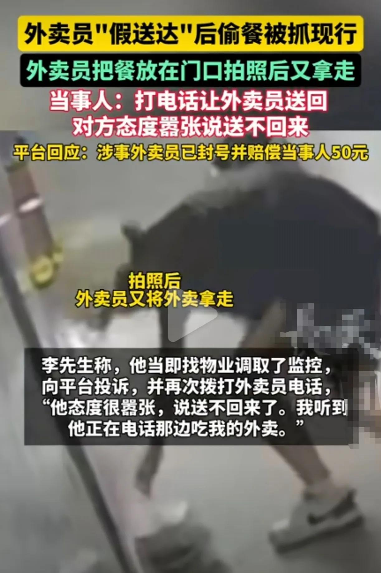得亏是安装了监控,不然还真说不清楚。 外卖小哥将外卖放在客户门口后,拍完照,紧接着就拎着外卖转身下楼。客户没找到外卖,怀疑是外卖小哥拿的,当场打电话让外卖小哥送回来,可小哥死不承认。随后客户调取监控向平台进行了投诉。客户再次联系外卖小哥,小哥态度还很嚣张,表示送不回来了,正在吃。[黑脸]就很离谱,看来小哥是真饿了啊。外卖 偷外卖