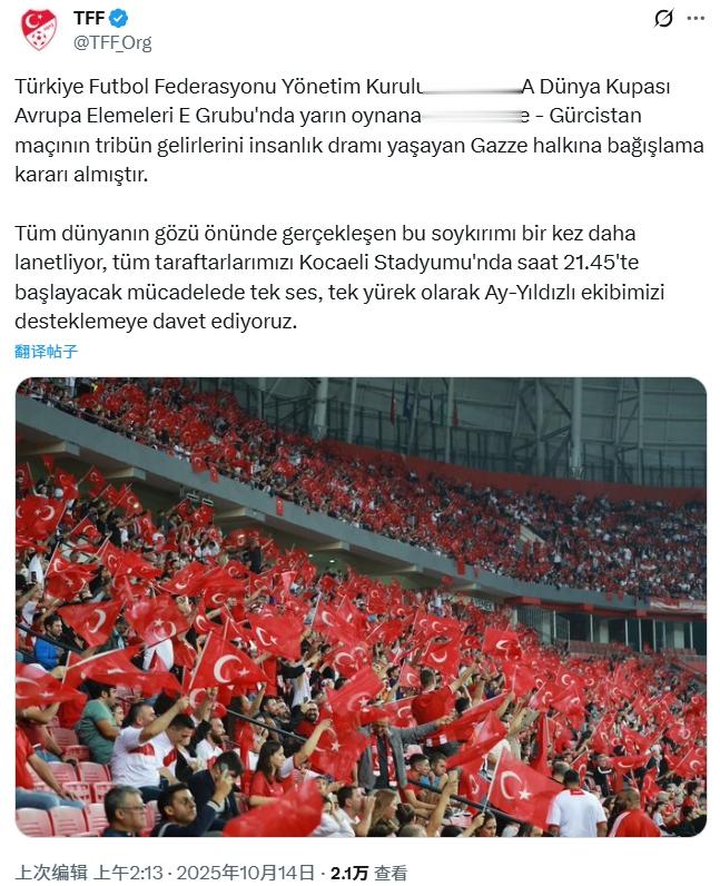 土耳其足协董事会决定,将明天举行的土耳其对阵格鲁吉亚比赛的门票收入捐赠给遭受人道主义灾难的加沙人民。