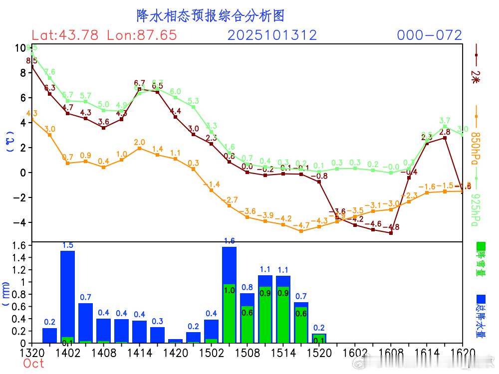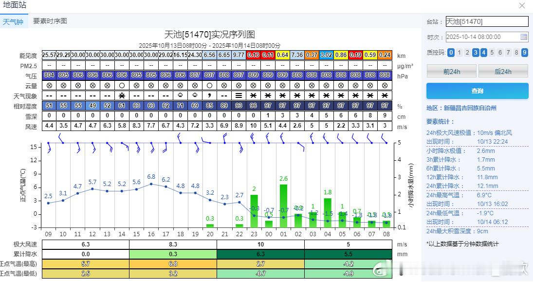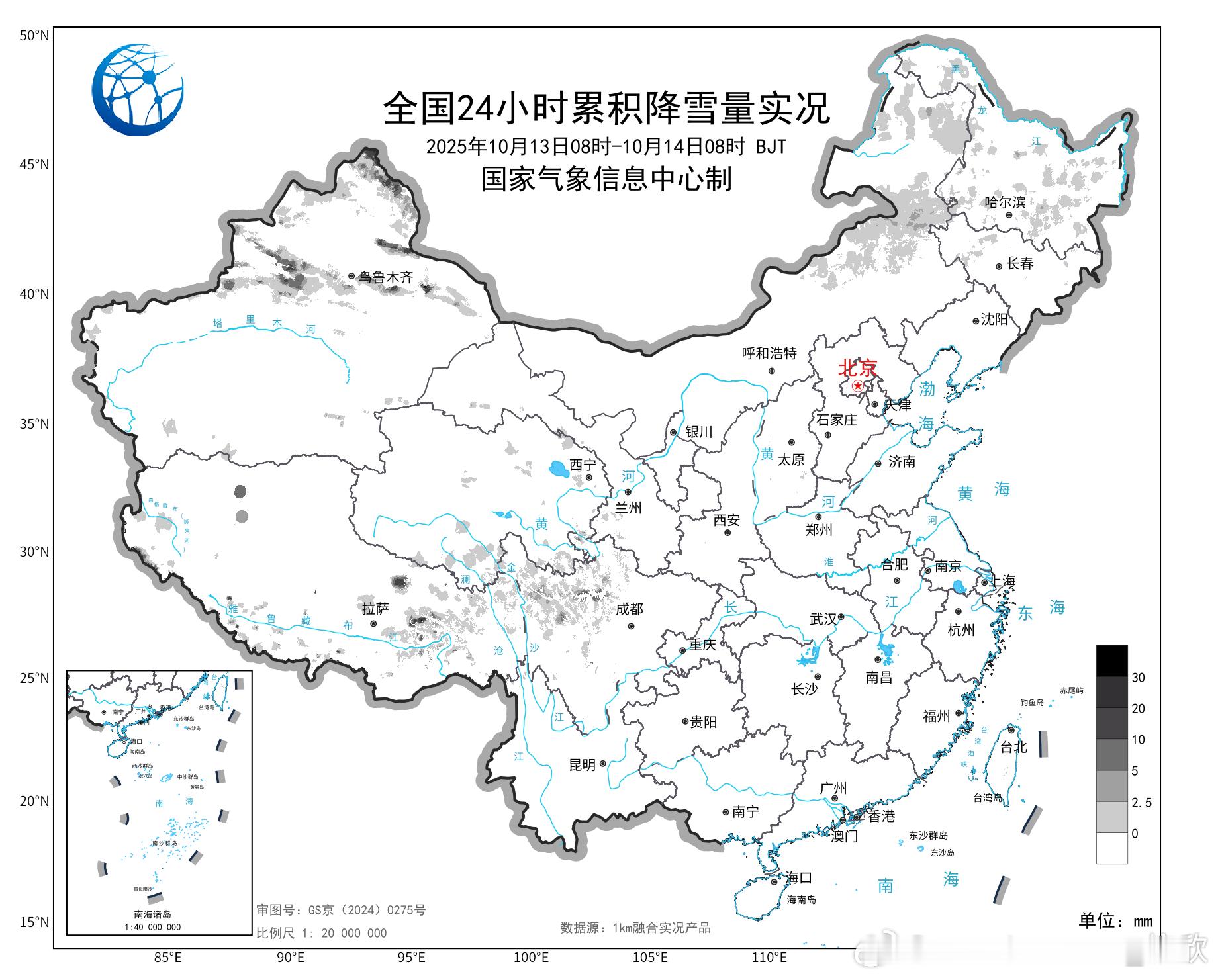 此外新疆北部也出现降水,天山和阿尔泰山出现降雪。天山的天池出现暴雪,今晨8时积雪有9厘米。今天到明晨,新疆沿天山地区、内蒙古东部、吉林西部、黑龙江南部等地有小到中雪或雨夹雪,局地大到暴雪;乌鲁木齐在15日晨、哈尔滨在15日晨,均有机会迎来今冬初雪。