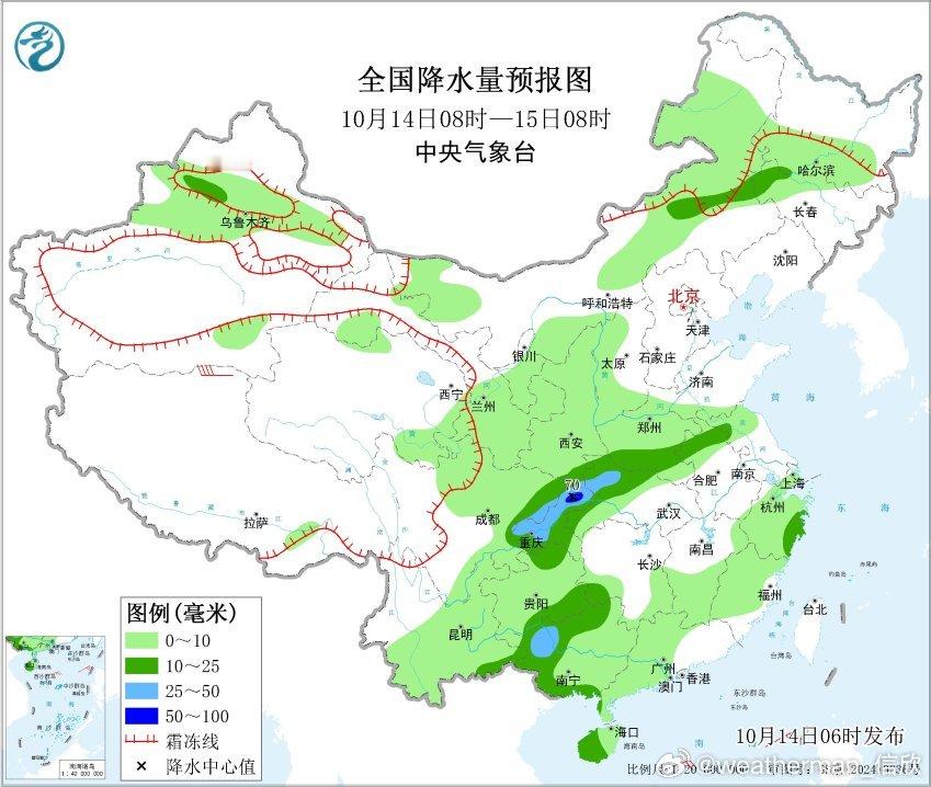 另外10月14日08时至15日08时,黄淮南部、江汉西部和北部、西南地区东部、华南西部、海南岛西部等地部分地区有中到大雨,其中,重庆东北部等地局地有暴雨(50~70毫米)。