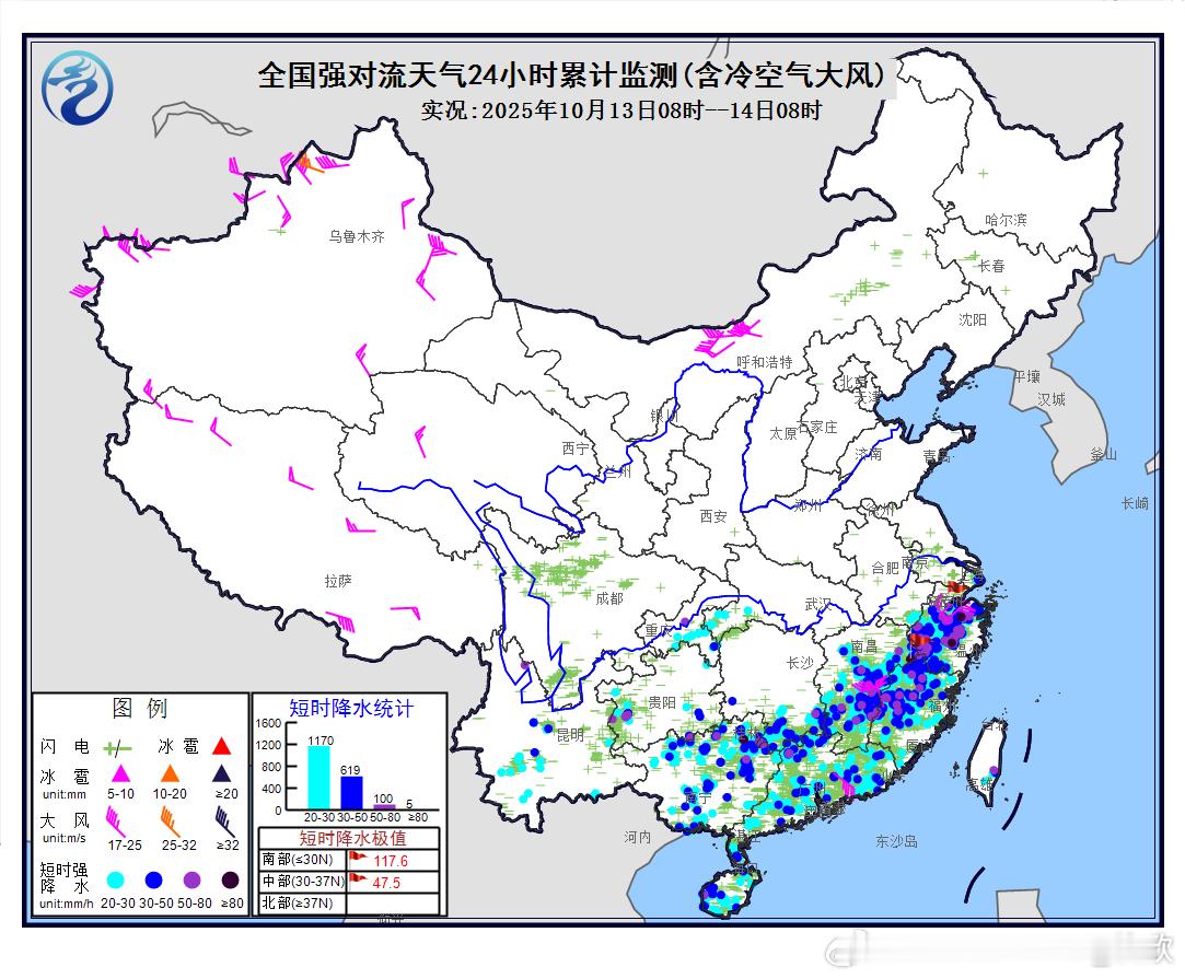 【降水】昨天到今晨,南方有两片降水区,偏北的重庆-江苏一带,为700百帕切变线降水。偏南的浙江福建江西湖南广西广东一带为低空925百帕切变线以及南侧暖区对流导致的降水。偏南的这条雨带上,出现了不少短时强降雨。广西恭城112.3毫米,打破当地10月单日降水量纪录。