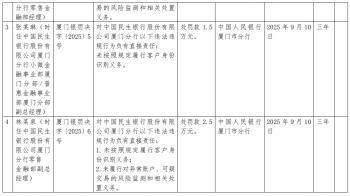 台海网10月14日讯根据中国人民银行网站近日发布的行政处罚信息公开表(厦门银罚决字〔2025〕3号-6号)显示,因1.违反反假货币业务管理规定;2.违反数据安全管理规定;3.未按照规定履行客户身份识别义务;4.未履行对异常账户、可疑交易的风险监测和相关处置义务;5.违反账户管理规定,中国人民银行厦门市分行对中国民生银行股份有限公司厦门分行警告,通报批评,并处罚款合计147.96万元。