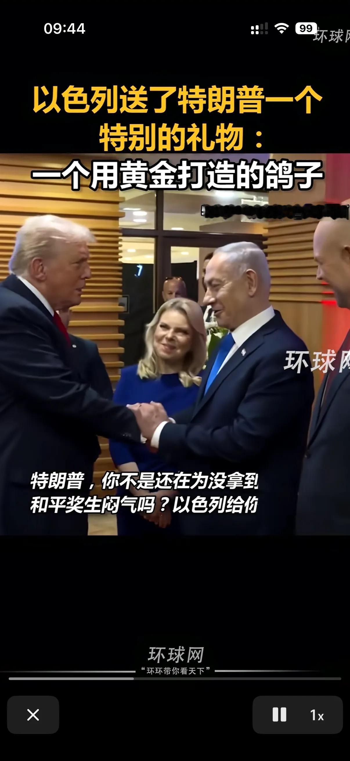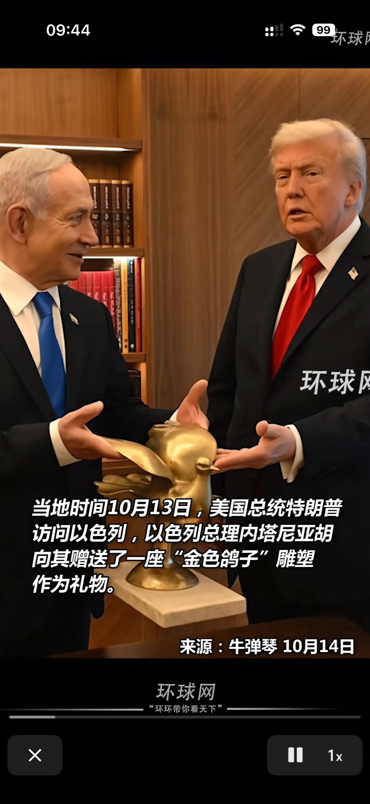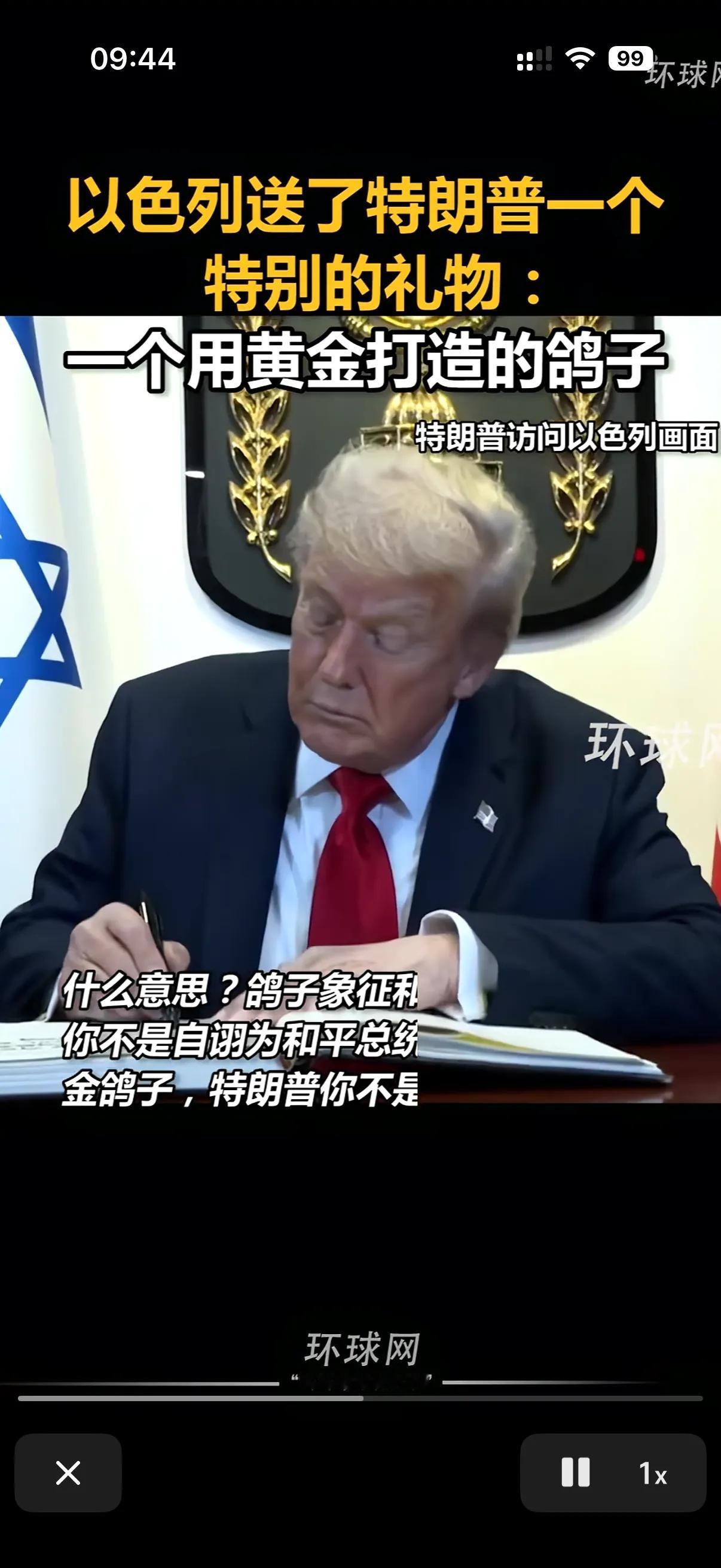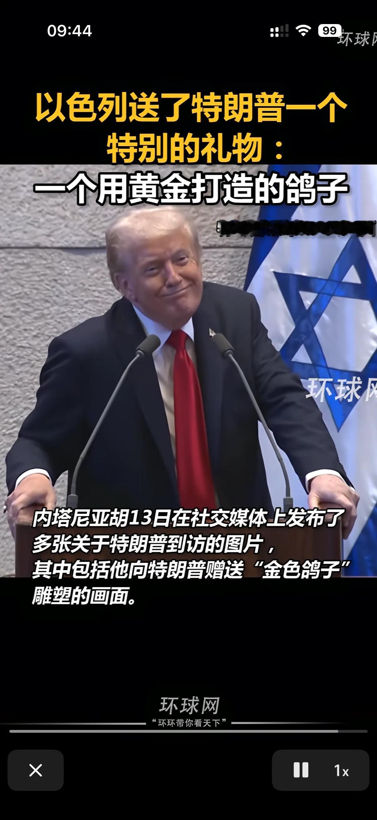 不得不说,以色列是懂送礼的,懂王特朗普喜欢什么,那肯定是钱了,有比钱更让特朗普开心的那就是钱和名声一起送了! 昨天特朗普到了以色列出席一场演讲后,以色列总理内塔尼亚胡送给了特朗普一个金色和平鸽的雕塑,要知道平时和平鸽都是白色的,但是这次以色列送给特朗普的偏偏是金色的,尤其是在特朗普没得到诺贝尔和平奖的时候,要知道金色的东西一般都是颁奖的时候用! 至于这个金色的和平鸽是不是金子做的就不得而知了!