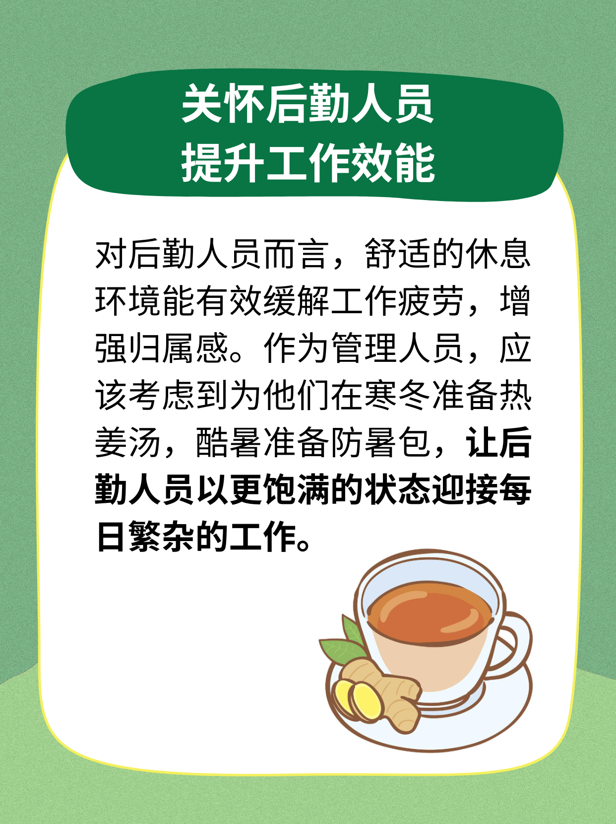 一、将休息区融入市场管理办公室 二、完善设施配置,满足多元需求 三、注重人性化细节,提升体验感受 四、关怀后勤人员,提升工作效能 五、优化管理方式,增强团队凝聚 六、后勤高效运转,增强竞争实力