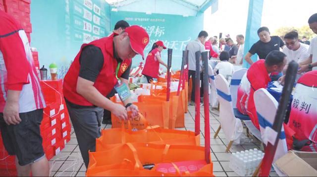 志愿者在签到处发放物资。