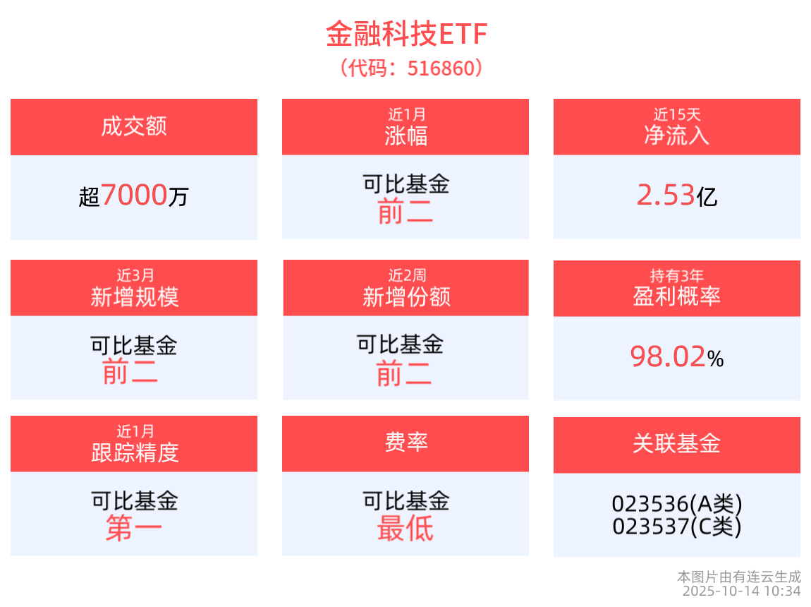 流动性方面,金融科技ETF盘中换手2.85%,成交7143.41万元。拉长时间看,截至10月13日,金融科技ETF近1月日均成交2.78亿元,排名可比基金前2。