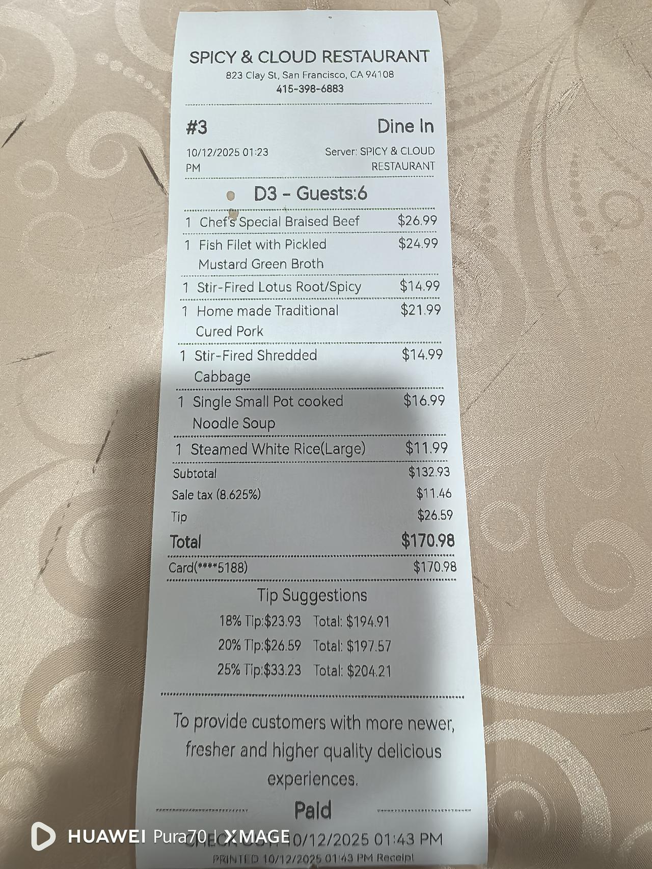 在旧金山唐人街午饭,消费170美元,贵吗? 昨天,娃娃开车带我们去旧金山玩,到了渔人码头、金门大桥,恰逢城里在开展意大利文化游行,所以城里面很热闹。 在渔人码头,还有“舰队周”展演,它是一个海事十航空十军事展示节庆活动。我们还免费领取了很多小纪念品。在金门大桥还观看了精彩的飞行表演。 中午,我们专程到唐人街吃中国莱。这里见证了早期华人的奋斗打拼历史,有浓厚的中华文化印迹。我们选择了一家叫“云香阁过桥米线”的餐馆就餐。点了“烧牛肉、酸菜鱼、腊肉、争撕苞菜、炒藕片和一份沙锅米线”,味道还行。加税和小费共消费170.98美元,娃娃们说很实惠,我总感觉还是贵了,我们总是习惯和人民币对比,就觉得很贵。 说实话,从生活消费角度讲,1元人民币和1美元,差距不大。也就是说,在美国挣1000美元,和在中国挣1000人民币,从汇率角度看,差距很大,1:7点多,但从日常生活水平看,是差不了太多的。我们应该珍惜我们在国内的美好生活。
