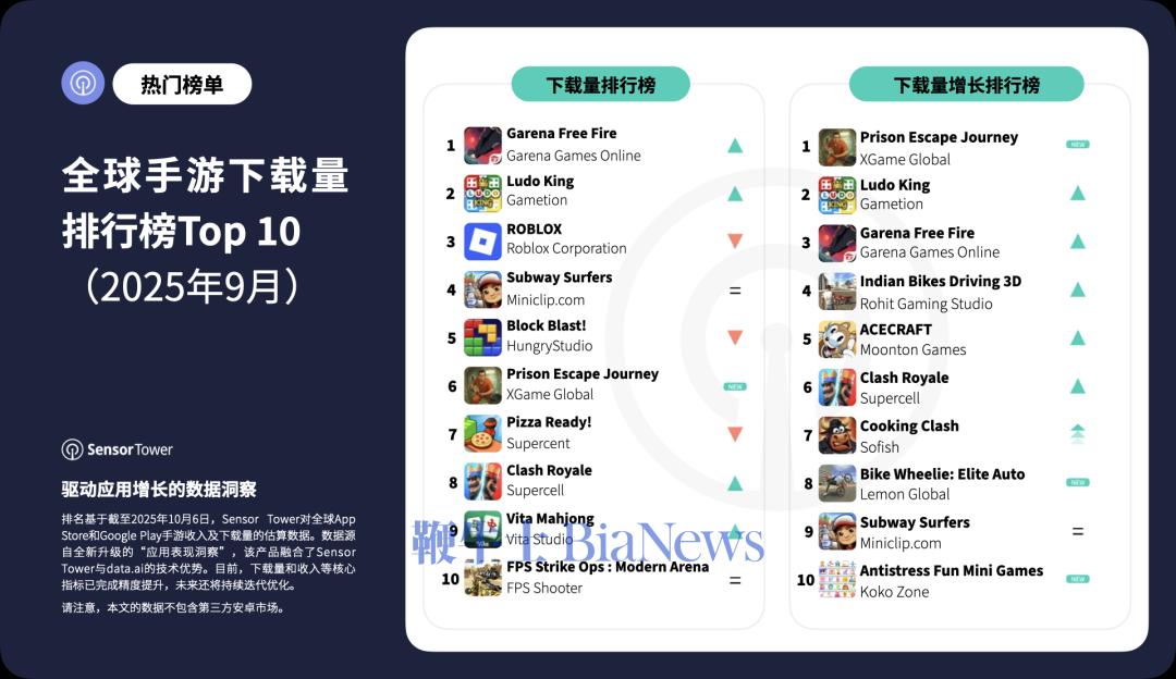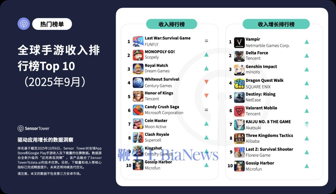 榜单显示,《LastWar:SurvivalGame》登顶2025年9月全球手游收入榜。《MONOPOLYGO!》紧随其后位列第2,《RoyalMatch》位列第3。《WhiteoutSurvival》位列第四,《王者荣耀》下降三名,跻身前五。