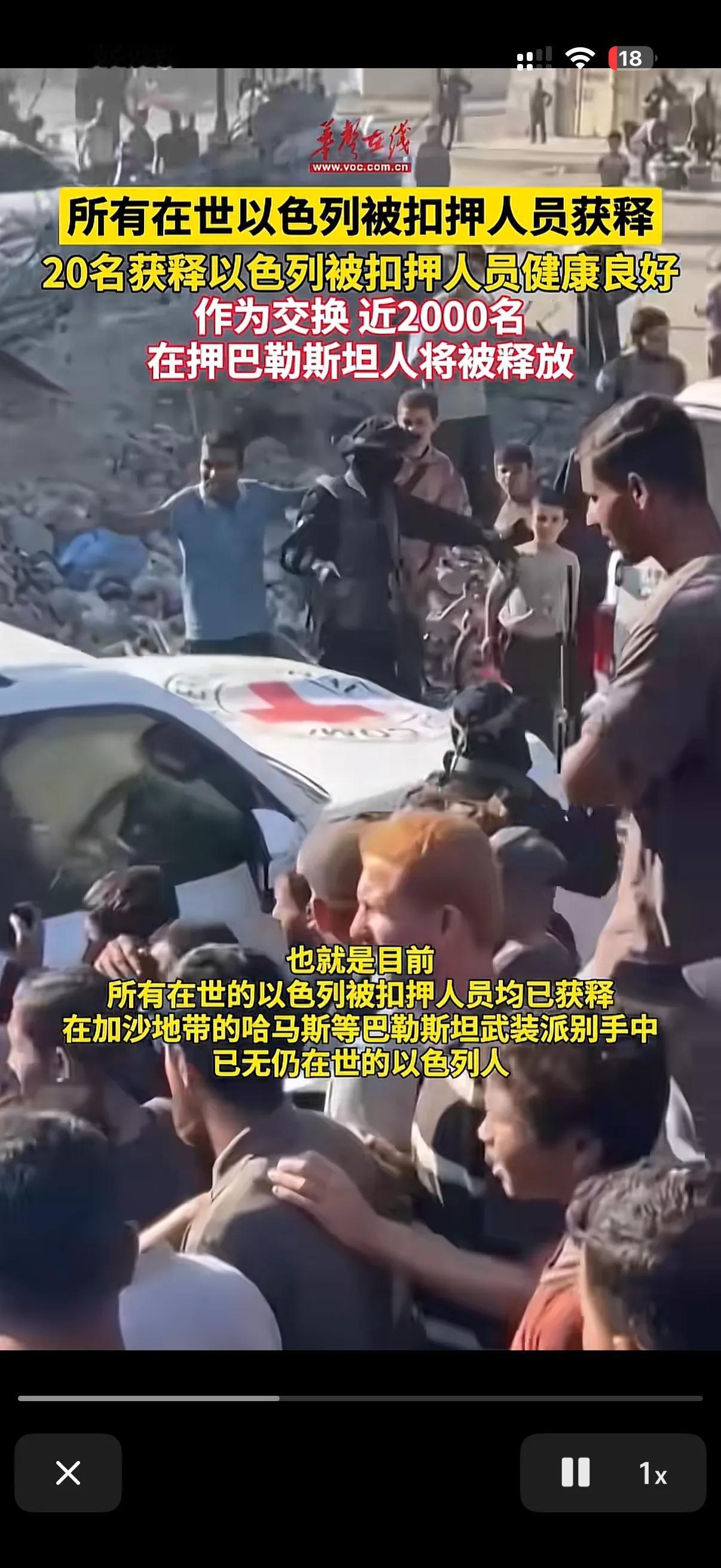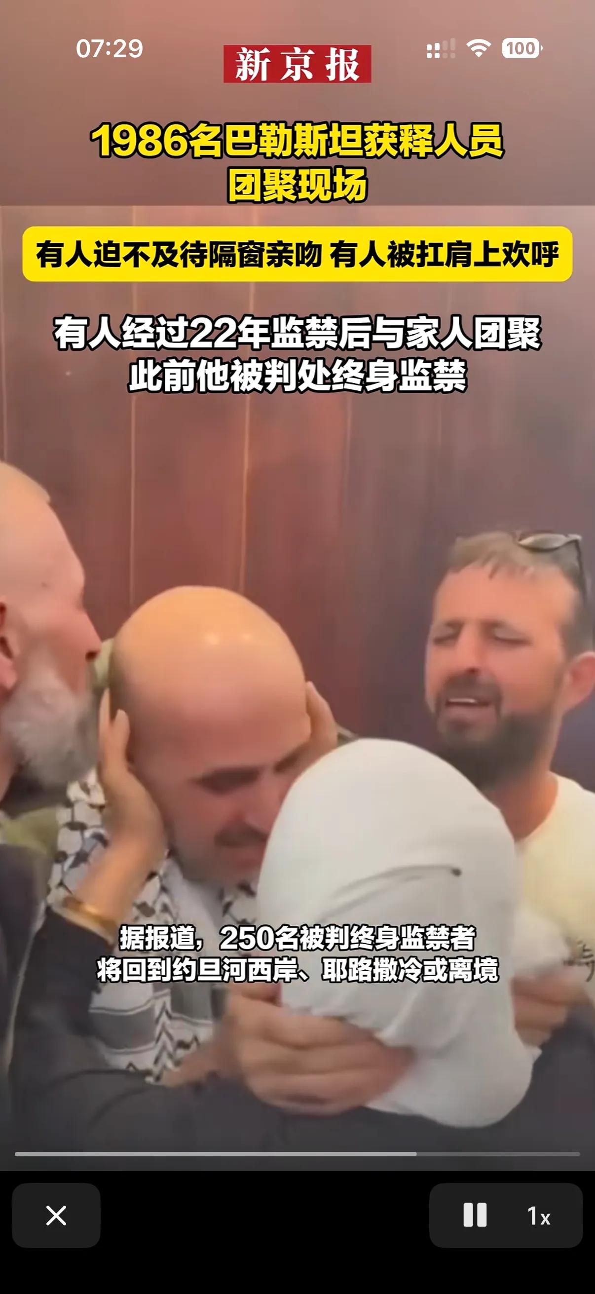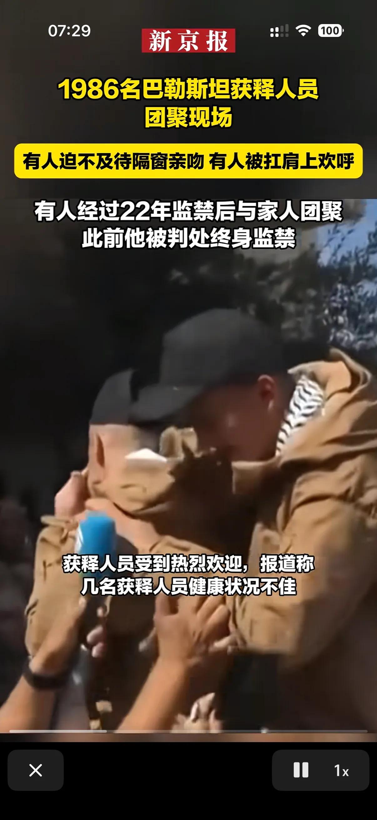 以色列和哈马斯终于开始互相交换人质了! 虽然在发表停火声明后双方都还有小规模冲突,但是加沙这里终于迎来了和平的实质进展,那就是双方开始第一阶段的互相释放对方的扣押人员,哈马斯释放了在押的20名以色列人。 而以色列这面也释放1986名巴勒斯坦国人。这其中还包括了被拘押了22年之久的人。 不得不说最开心的莫过于这些被释放的人的家人了! 接下来还有28名以色列被扣押人员的遗体也会被交还给以色列! 也有些人担心,现在双方手里都没有了对方的人质,那么一旦战争重启,那么以色列和哈马斯是不是就无所顾忌了呢! 也有人说,一旦战争开启,那么无论对方手里有没有彼此的人质,哈马斯也好还是以色列也好都不会为了人质妥协的,毕竟只有战争胜利了才有权利谈一切。 不过不管将来如何,至少目前为止,哈马斯和以色列表现出来的都是努力向和平方面推进!
