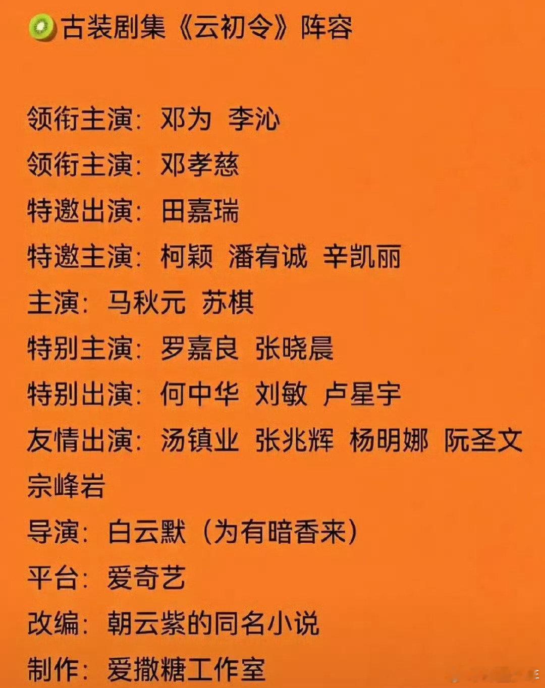 网传邓为李沁出演云初令云初令网传阵容 《云初令》网传阵容:邓为、李沁、邓孝慈、柯颖、潘宥诚、辛凯丽、马秋元、苏棋等等,都是实力派演员,期待了[打call]