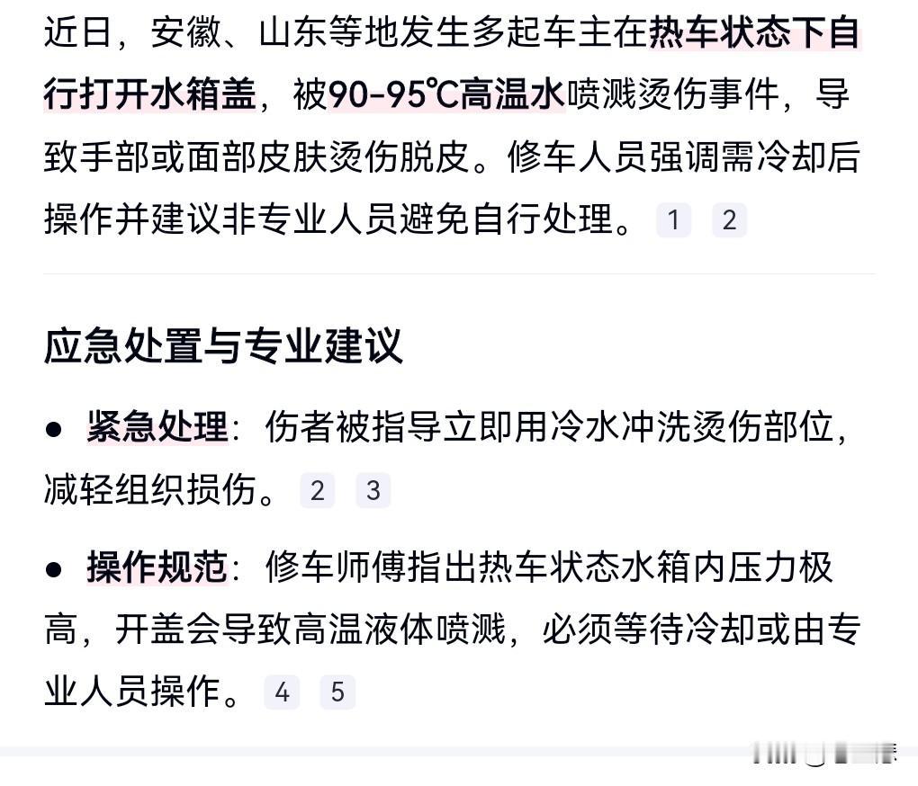 看来专业的事情要交给专业的人来做。 近日,安徽、山东等地,发生多起车主在热车状态下,自行打开水箱盖被烫伤的事件。 这真是敲响了警钟啊。 安全常识是一定要有啊。 这种事情还是要冷却之后再打开,或交给专业人员来处理,不要擅自打开。