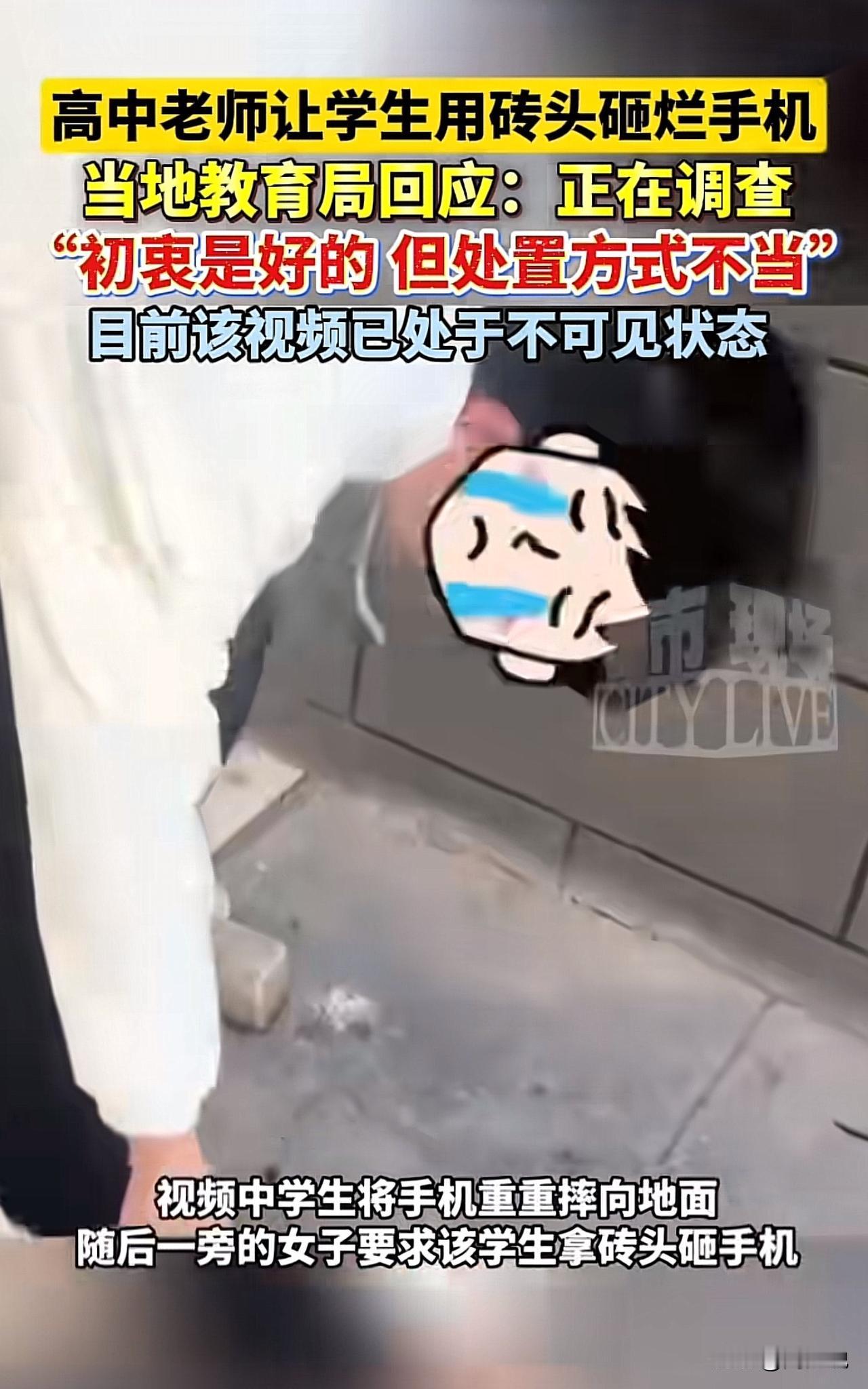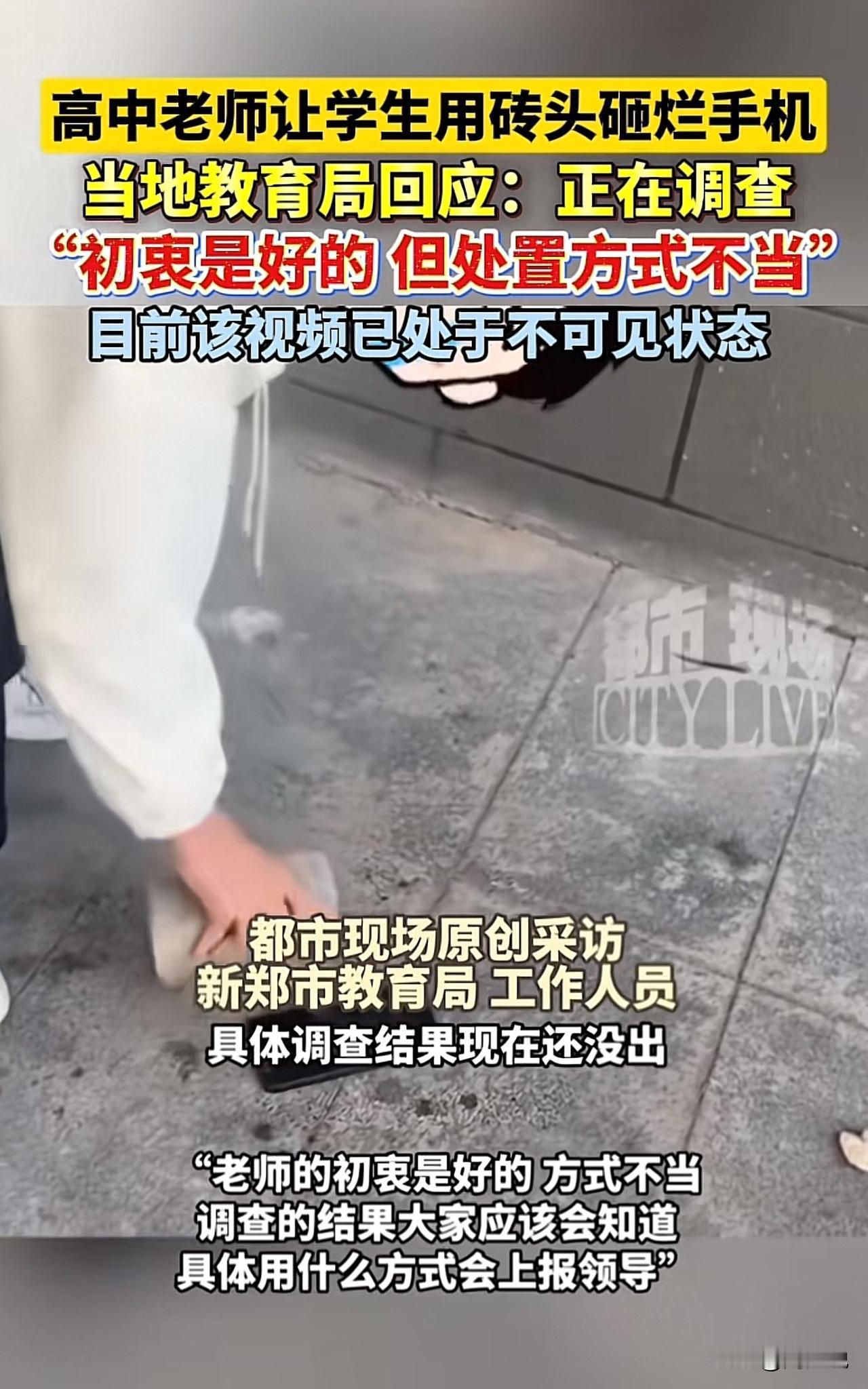 老师让学生当众用砖砸手机?教育局回应了! 近日,河南郑州新郑市第二中学引发热议:有学生带手机到校,老师竟让其当众用砖头砸烂。视频中,老师先确认家长同意,随后不断催促“用力砸”。事件曝光后,网友纷纷质疑这种处理方式。 针对此情况,新郑市教育局回应称,已介入调查,承认该方式对财物不当,虽老师初衷是好的,但方式欠妥。 此事曝光后,众多网友纷纷表示,“教育的本质是引导而非破坏,这种做法不仅伤财,更可能伤害学生的自尊心和信任。” 在周少看来,老师初衷可能是好的,但教育不是暴力,这样只会激化矛盾,让学生产生逆反心理。不管怎么样,这种让学生砸手机的行为都不妥,涉事老师真要反思。 对于这样的情况,大家觉得老师和学校应该用什么方式处理学生带手机的问题呢?#寻美三湘# #长沙新朋友#
