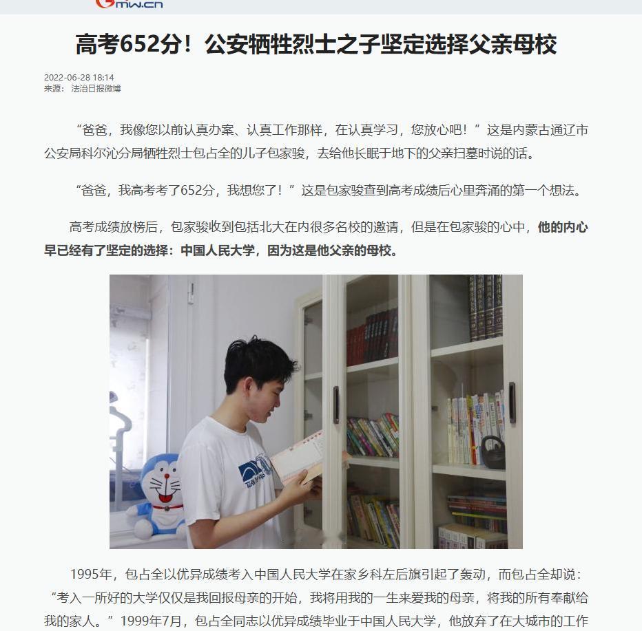 2016年,内蒙古一副所长因不肯徇私而因公殉职,6年后他的儿子高考652分,谢绝北京多家名校后,做了一个出人意料的决定…… 麻烦看官老爷们右上角点击一下“关注”,既方便您进行讨论和分享,又能给您带来不一样的参与感,感谢您的支持! 2016年7月的一个夏夜,内蒙古通辽市科尔沁区的派出所门口传来几声枪响,37岁的副所长包占全刚结束一天的工作,正准备开车回家,一个熟悉的身影突然冲过来,对准他的头部连开数枪。 这个人是同单位的工勤人员杜文杰,而这场蓄谋已久的凶杀案,起因只是一家小小的电玩城。 几个月前,包占全接到群众举报,辖区内有家电玩城涉嫌开设赌博,他带队前往检查,当场查获29台赌博机。 这些机器表面上是娱乐设施,实际上吸引了不少人沉迷其中,有些家庭甚至因此倾家荡产,按照法律程序,包占全将赌博机全部没收,责令电玩城停业整顿,并对负责人进行处罚。 电玩城背后的实际经营者正是杜文杰,这个通过关系进入派出所的年轻人,利用工作便利在外开设赌场牟利。 财路被断后,他多次找包占全求情,甚至暗示可以私下“意思意思”,包占全的态度始终很明确:警察就要守法,没有商量余地,这份坚持让杜文杰怀恨在心,最终酿成悲剧。 枪声响起后,同事们冲出来时只看到包占全躺在血泊中,凶手已经开着警车逃离现场,通辽警方立即展开全城搜捕,一位出租车司机打来电话说车上捡到一把手枪,正是杜文杰的配枪。 循着线索,民警在一家小旅馆找到了他,从案发到抓捕,不到8个小时,面对铁证,杜文杰交代了全部犯罪事实,最终被判处死刑。 包占全牺牲的消息传回家中,妻子纪春艳几乎崩溃,家里还有年迈的母亲需要照顾,13岁的儿子包家骏正在上初中,以后的日子该怎么办? 社区和包占全生前的同事们伸出援手,时常来家里帮忙,给这个破碎的家庭带来一些温暖。 少年时期失去父亲,对包家骏的打击可想而知,悲痛之后,他做出一个决定:要成为家里的男子汉,用实际行动告慰父亲。 从那以后,他的生活轨迹完全改变,每天凌晨四点半起床,在家自学两个小时,然后匆匆吃点东西赶去学校。 放学后别的同学在操场上打球聊天,他回到家继续埋头做题,周末也很少休息,把所有精力都投入到学习中。 这样的日子持续了六年,2022年高考,包家骏考出652分的好成绩,这个分数足以让他进入国内任何一所顶尖大学,北京大学、清华大学都向他抛出橄榄枝,录取通知书一封接一封地寄到家里。 所有人都以为他会选择这些名校,包家骏却做了一个让人意外的决定:去中国人民大学。 这所学校是父亲当年的母校,1995年,包占全从科尔沁考入人民大学行政管理专业,毕业后回到家乡成为一名基层民警。 他用17年时间破获上百起案件,调解无数纠纷,抓获30多名逃犯,获得过三等功和优秀公务员称号。 包家骏说,选择父亲的母校,是想沿着父亲走过的路继续前行,把那份未竟的事业传承下去。 在父亲墓前,包家骏轻声说:“爸爸,我考上您的母校了,以后会走您没走完的路。” 这个曾经在派出所门口问父亲“我长大后能当警察吗”的孩子,现在有了更坚定的目标,他要学习法律知识,了解社会现实,最终成为像父亲那样刚正不阿的人民警察。 包占全用生命诠释了什么叫坚守原则,在金钱和人情面前,他选择了法律和良心,这种品质在今天显得尤为珍贵。 包家骏则用行动证明,英雄的精神可以代代相传,他没有被父亲的牺牲击垮,反而将悲痛化为动力,让自己变得更加强大。 这个故事里没有惊天动地的情节,只有一个普通警察的坚守和一个少年的成长,包占全倒在执法路上,留给儿子的是一个背影。 包家骏追随这个背影,走向更广阔的未来,这或许就是传承最朴素也最动人的模样。 对此大家有什么想说的呢?欢迎在评论区留言讨论,说出您的想法! 信源:光明网——高考652分!公安牺牲烈士之子坚定选择父亲母校