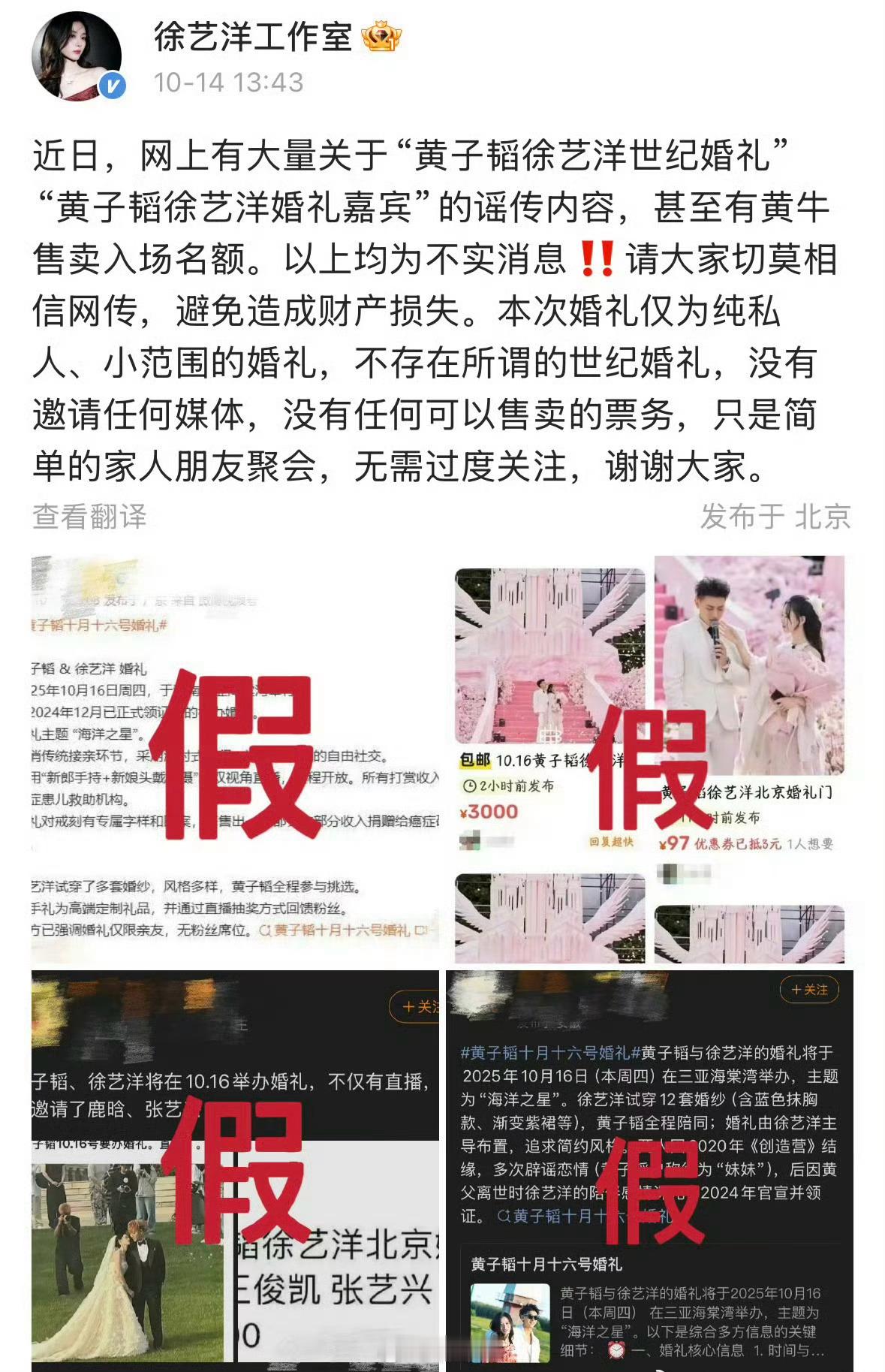 黄子韬、徐艺洋工作室辟谣网传婚礼信息“黄子韬徐艺洋世纪婚礼”“黄子韬徐艺洋婚礼嘉