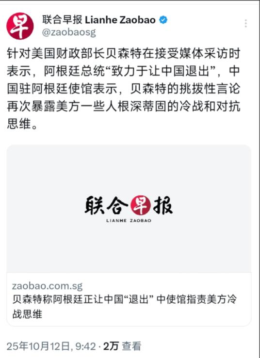 外媒今天(10月12日)报道:“针对美国财政部长贝森特在接受媒体采访时表示,阿根廷总统‘致力于让中国退出’,中国驻阿根廷使馆表示,贝森特的挑拨性言论再次暴露美方一些人根深蒂固的冷战和对抗思维。” 美国这回确实把自己架在了尴尬的位置,以为扔出200亿美元就能让阿根廷跟着自己的节奏走,结果转头就被米莱摆了个明明白白。贝森特在福克斯新闻里,说米莱承诺“让中国退出阿根廷”,还把阿根廷吹成“拉美灯塔”,可这话刚落地,阿根廷内阁首席部长弗兰科斯就直接拆台,说根本没这协议,中国还是重要贸易伙伴,货币互换协议也好好的,等于当众给了美国一记耳光。 美方的算盘打得挺精,知道阿根廷正缺钱,刚经历选举失利,金融市场动荡得要靠外汇储备维稳,就抛出货币互换、回购比索这些诱饵,明摆着是拿经济援助当筹码,逼阿根廷在中美之间选边站。 可他们忘了,阿根廷的经济命脉早就和中国绑在一起了——这个国家三分之二的出口都和农业有关,农业创汇占了外汇来源的一半,而大豆又是农业出口的顶梁柱,全球第三大大豆生产国的名头可不是白来的。中国作为全球最大的大豆进口国,每年要吃掉1亿吨以上,这对阿根廷来说就是送上门的饭碗,怎么可能说丢就丢。 美国自己把一手好牌打烂了,之前因为贸易争端,美国大豆对华出口从占比近半跌到几乎归零,2024年还卖了130亿美元,今年直接被南美挤走了市场。 眼看着中国把订单分给巴西和阿根廷,美国就想捏软柿子,可阿根廷不吃这一套。 9月阿根廷刚宣布取消大豆出口预扣税,中国买家两天内就抢了20船,合计130万吨,没过多久又登记了40船266万吨,全是11到12月的船期,大部分都销往中国。 这操作直接让芝加哥期货交易所的大豆价格跌到每蒲式耳10.1美元,美国农民急得跳脚,农业部长都忍不住给贝森特发短信吐槽,说“我们救助阿根廷,他们却低价卖大豆给中国,这是觉得你傻”。 更讽刺的是,美国给阿根廷的200亿美元援助还没兑现,国会那边 already 吵成一团,可阿根廷这边已经靠着免税政策赚了70亿美元销售额。 米莱心里门儿清,美国的援助是带毒的橄榄枝,拿了就得把金融命脉交出去,以后政治经济都得听美国的,而中国给的是实打实的市场。就拿大豆来说,阿根廷免税后每吨价格比美国低10%,运输距离还短,中国自然愿意买;高粱更不用说,中国几乎包揽了阿根廷全部的高粱出口,米莱干脆直接提升出口标准,跟中国的要求对齐,摆明了要巩固合作。 美国这种“自己搞不定就拆台”的套路也不是第一次了,之前任命驻阿根廷大使,特意挑了个公开说要“遏制中国影响力”的彼得·拉梅拉斯,哪怕阿根廷社会骂这是“殖民主义威胁”,美国参议院还是强行批准了。 可这种霸权手段在利益面前根本不管用,阿根廷太清楚自己需要什么——中国手里有市场,能给外汇,还不附加政治条件,美国给的援助看着多,实则全是捆绑条款。就像中国驻阿根廷使馆说的,美方满脑子冷战思维,与其挑拨离间,不如做点实事,这话算是说到了点子上。 其实美国自己也知道这套行不通,只是放不下霸权架子。他们一边给阿根廷画饼,一边看着本国农民诉苦,印第安纳州的农民早就说了,政府补贴顶不上失去的中国市场,北达科他州的议员更是直言,救助阿根廷却坑了自家农民,这是颗难以下咽的苦果。 可即便如此,美方还是要硬撑着搞对抗,仿佛只要把中国挤出拉美,自己就能重新掌控一切。 但现实很骨感,阿根廷用实际行动选了利益而非霸权,中国的市场吸引力、平等合作的姿态,根本不是美国的胁迫能比的。这种靠施压维持的所谓“盟友关系”,终究抵不过实实在在的经济纽带。 美国要是一直抱着冷战思维不放,只想着搞破坏、分阵营,迟早会发现,越来越多国家不会再吃“霸权套路”这一套,毕竟谁也不会跟自己的饭碗过不去。