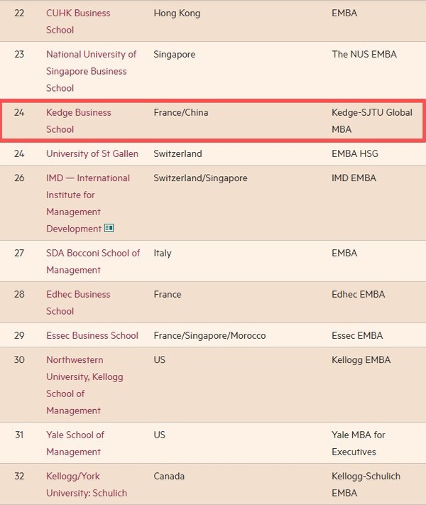 上海2025年10月14日/美通社/--FinancialTimes(英国《金融时报》)正式发布2025年度全球EMBA项目排名:KEDGEBusinessSchool(法国凯致商学院)与上海交通大学合作的SJTU-KEDGEGlobalMBAProgramme(上海交通大学-法国凯致商学院国际在职MBA项目)表现卓越,荣登全球总排名第24位,继续稳居全球领先行列。