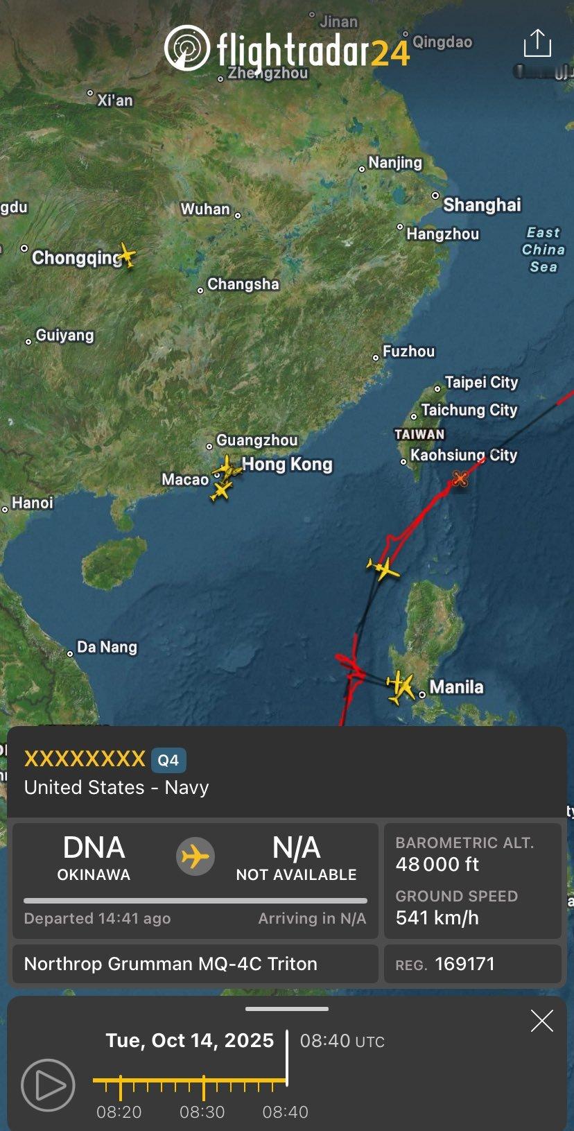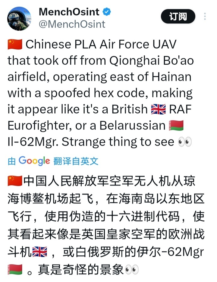 烽火问鼎计划有外网博主称,今天(14日),中国空军的一架疑似无侦-10无人机(伊尔-62是错误代码)首次出现在菲律宾海岸附近活动,而美国海军的一架MQ-4C无人机正在离开该地区。