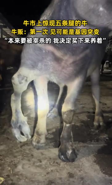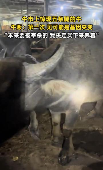 “活久见!”10月14日,广东阳江,一男子在牛市上发现了一头长了五条腿的牛,牛贩也表示是第一次见,这头牛本来要被宰杀,男子于心不忍决定将牛买下养着,网友:世界之大无奇不有! 四条腿的牛天天见,五条腿的牛你见过吗?其实“五脚牛”此前曾在我国多地出现过,在印度,长了五个脚的牛还被称作“神牛”,预示着好运和繁荣。 一男子在逛牛市时发现了一头特别的牛,这头牛竟然长了五条腿,除了正常走路的四条腿外,牛一侧的肩胛骨上还多长了一条腿,这条腿很完整,牛蹄也与正常的牛蹄无异,只是不能用来走路。 这是男子第一次见到五条腿的牛,他觉得很神奇,牛贩子也表示自己和牛打交道这么多年,也是第一次遇到这种情况。 这头“五脚牛”本来是要被宰杀的,可男子看着有些于心不忍,于是出钱将其买下带回了家,他决定自己养着。 牛长出第五条腿的原因大概率是基因突变,可能是因为生长环境恶劣或者小牛自身基因的选择,才导致基因突变的发生。 不少网友见到“五脚牛”后惊奇不已,也纷纷为男子的善良点赞,这头牛看起来确实很可怜,希望男子能好好善待它! 信息来源:《牛市上惊现五条腿的牛,牛贩:第一次,见可能是基因突变》安徽广播电视台