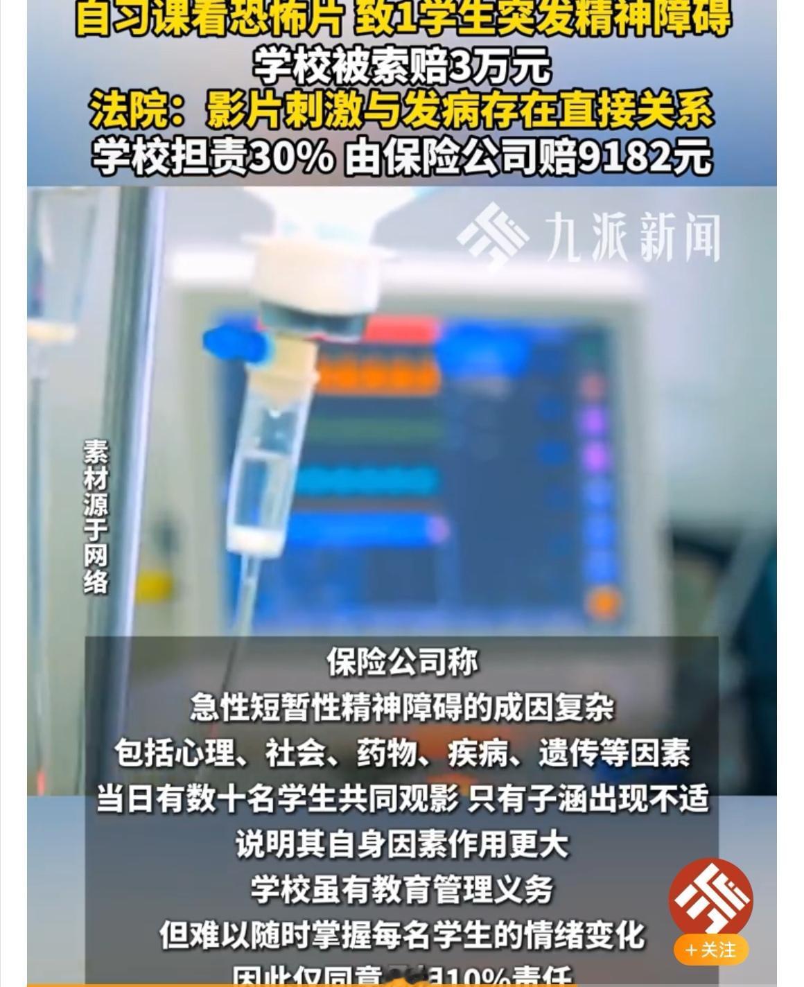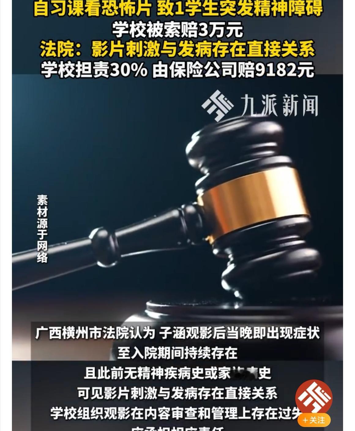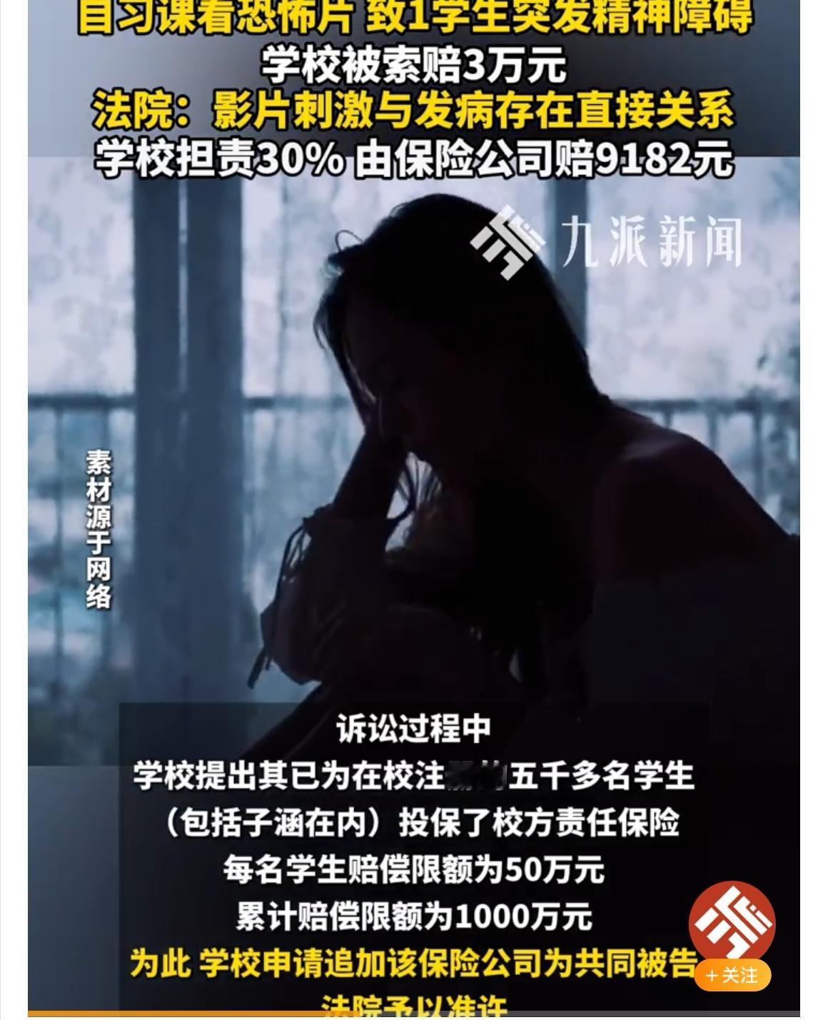 【自习课竟播放恐怖片,广西一学生精神失常,家长索赔三万引热议!】 广西某中学发生一起令人咋舌的事件——自习课居然成了“恐怖电影放映时间”,结果闹出了麻烦。学生子涵在课上观看了恐怖片,当天晚上就出现了胡言乱语、情绪异常等状况,没几天医院下了诊断:急性短暂性精神障碍。这下家长坐不住了,一口咬定是电影惹的祸,把学校告上法庭,还索赔三万多元。 面对这番指责,学校和保险公司都觉得主要责任不在自己,只肯承担各自10%的责任。可法院最终判定:“恐怖片的刺激与孩子发病直接相关,学校管理确实有问题。”于是保险公司被判赔偿9182元。至于剩下的钱,家长还得自己扛。 这波操作,不少网友吐槽:自习课放什么不好,非挑恐怖片,是不是明摆着给自己添堵?其实,这事儿也给所有学校提了个醒——教学管理得上点心,特别是心理健康方面,千万不能掉以轻心。毕竟成长中的孩子心智还不成熟,突如其来的刺激可能带来难以预计的后果。 通过这起案例也能看出,未成年人心理健康问题不容小觑,而学校作为监管方,绝不能把“娱乐”当成无害调剂。安全第一,才是真正的教育底线。