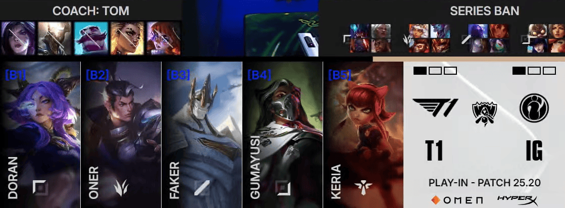 T1选用:Doran加里奥、Oner赵信、Faker安妮、Gumayusi芸阿娜、Keria烈娜塔